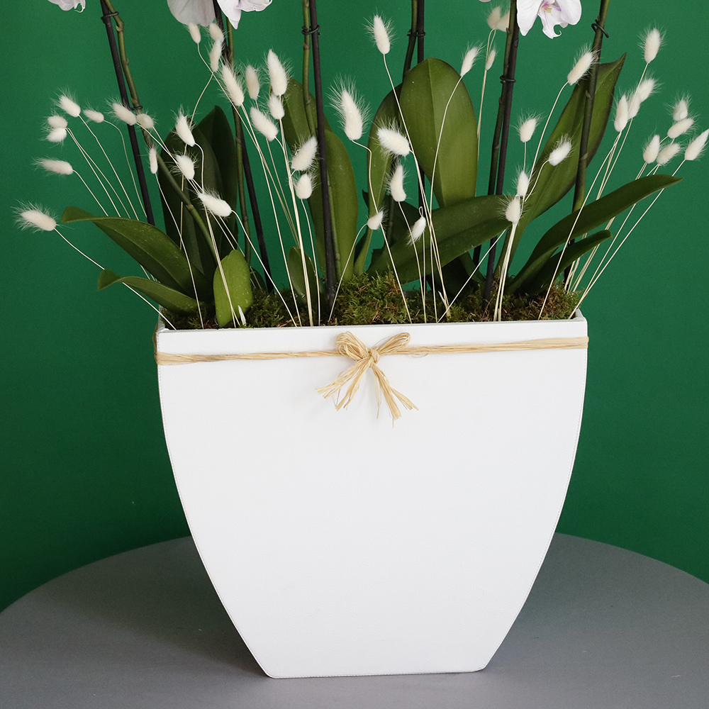 | زهرة الأوركيد الوردية الرائعة في مزهرية بيضاء فاخرة |
