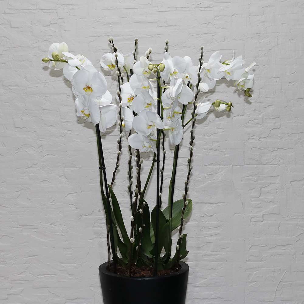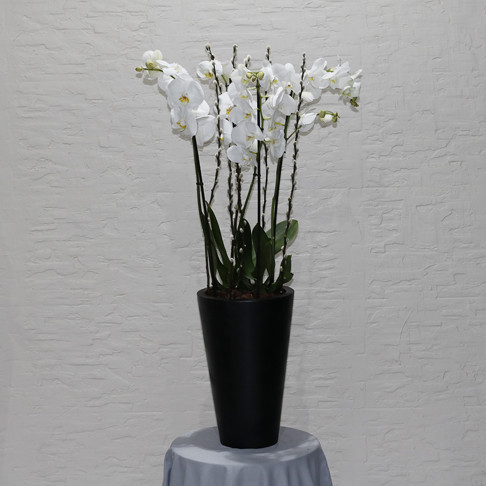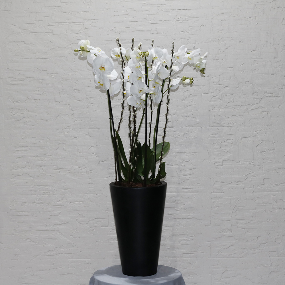 | أوركيد بيضاء مذهلة في مزهرية طويلة مستديرة سوداء |