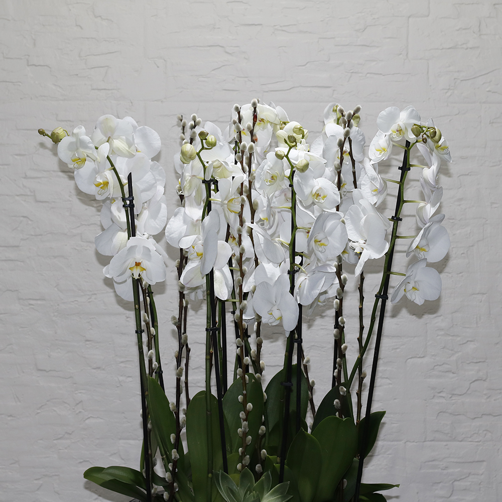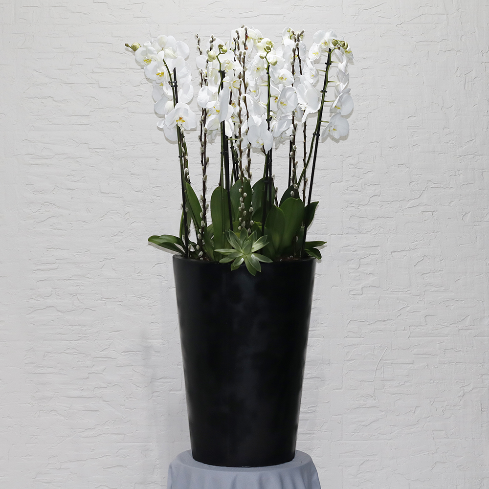 | أوركيد بيضاء مذهلة في مزهرية طويلة مستديرة سوداء |