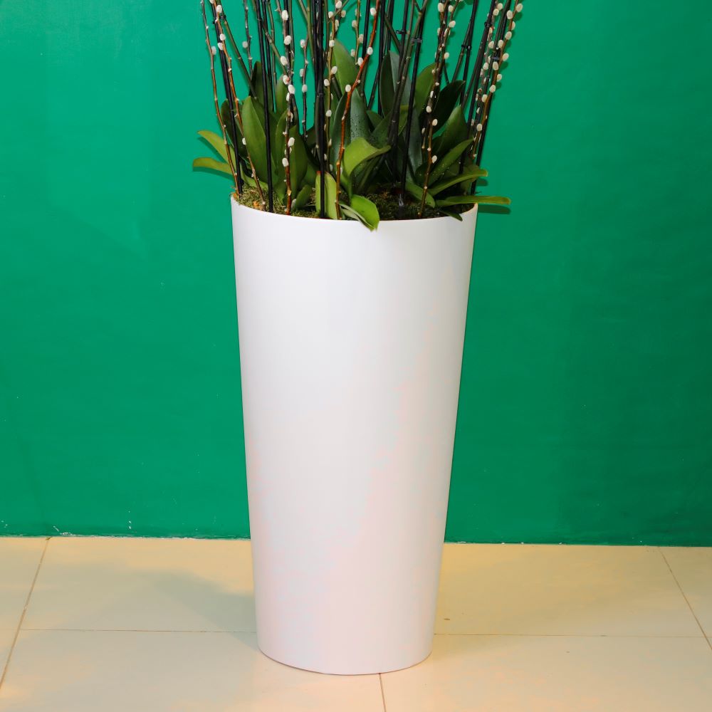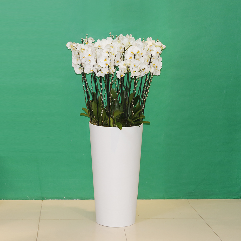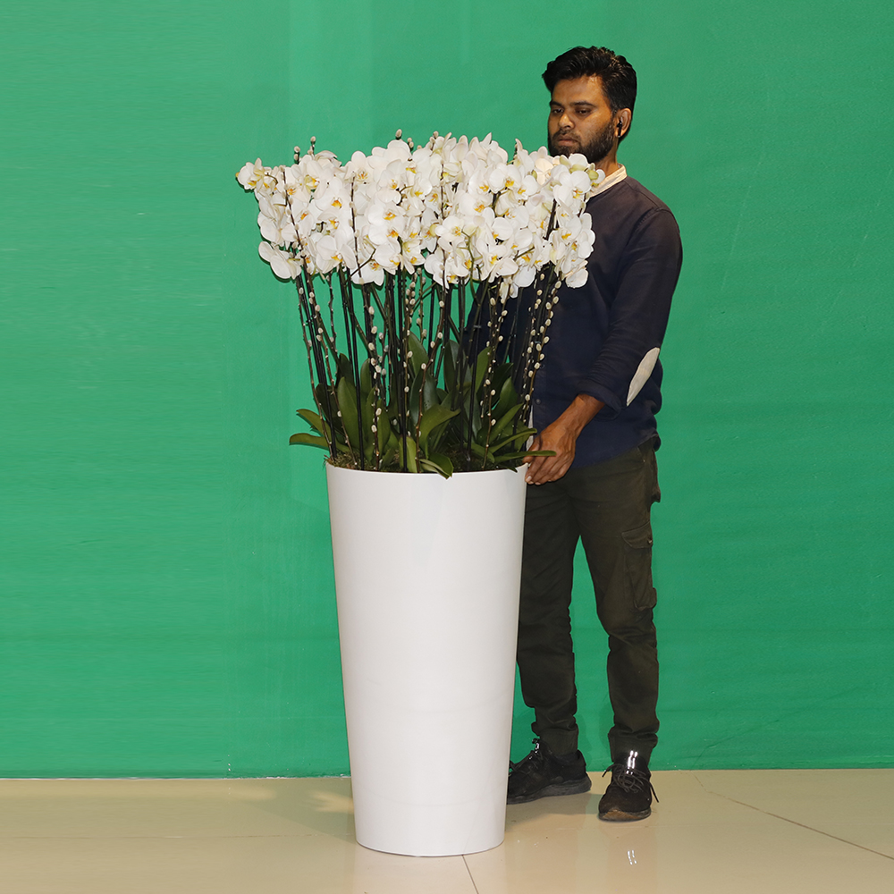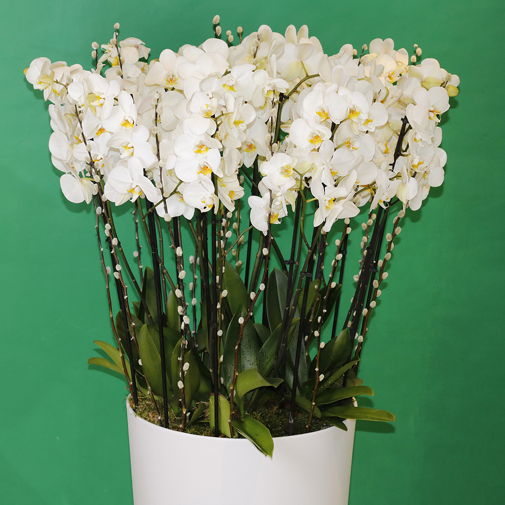 | تنسيق زهور الأوركيد الرائعة في مزهرية دائرية طويلة |