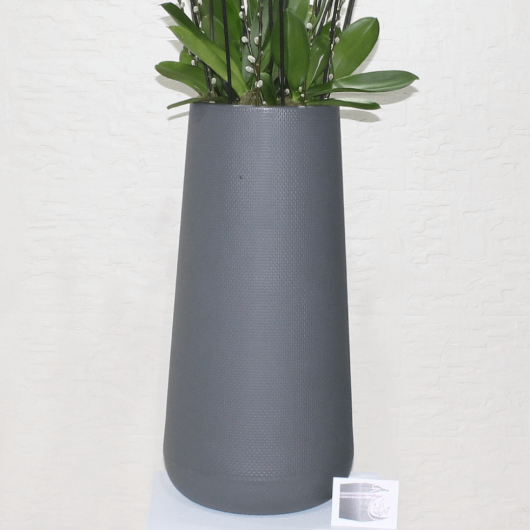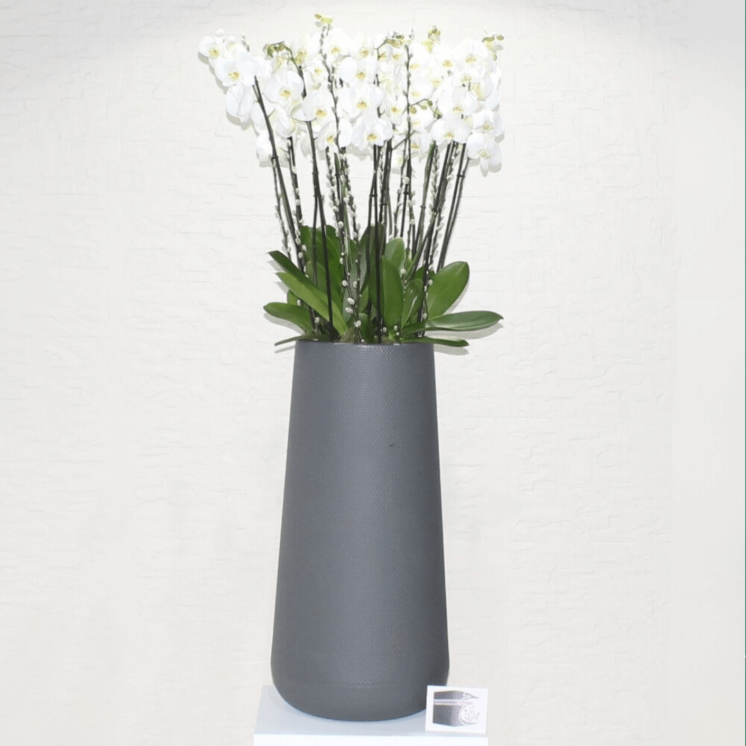 أوركيد بيضاء جميلة في مزهرية طويلة رمادية اللون