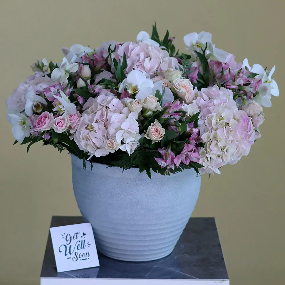 This bouquet contains Hydrangeas roses touch orchid in a amazing vases.