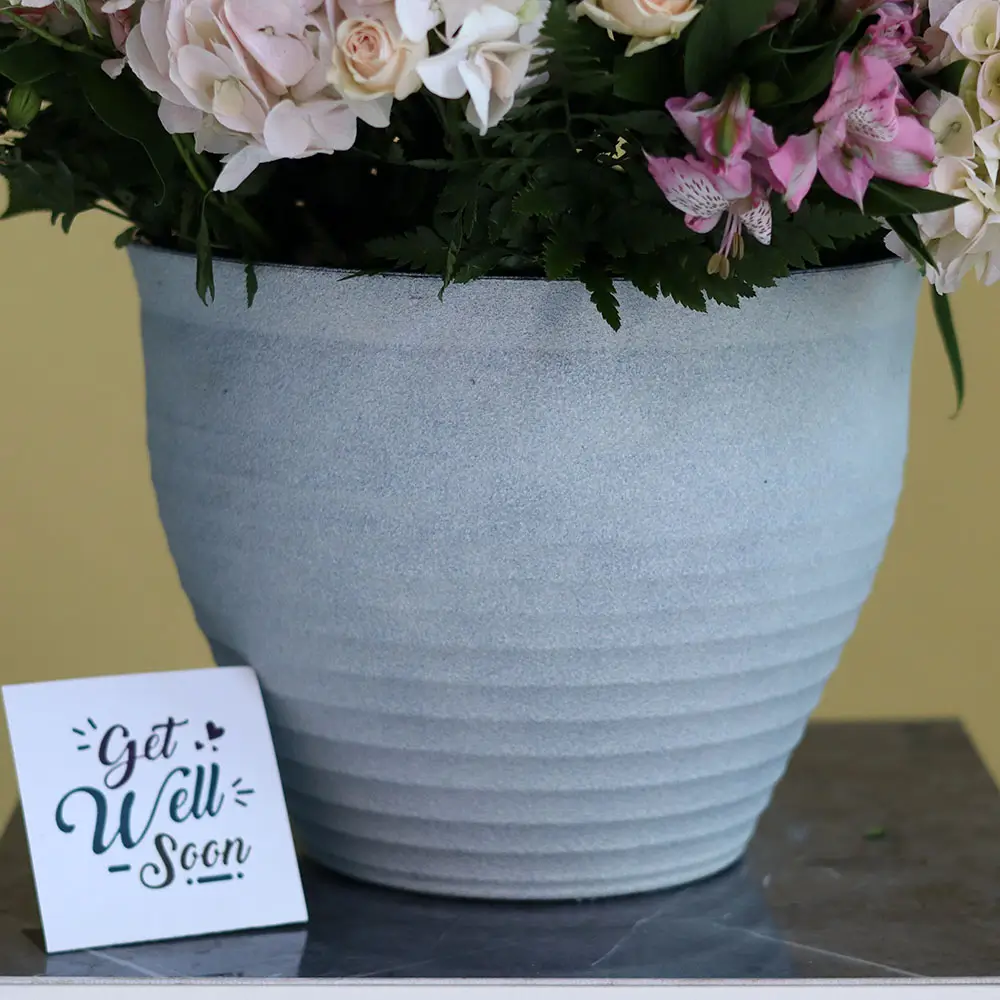 تحتوي هذه الباقة على زهور الكوبية وزهرة الأوركيد في مزهريات مذهلة.