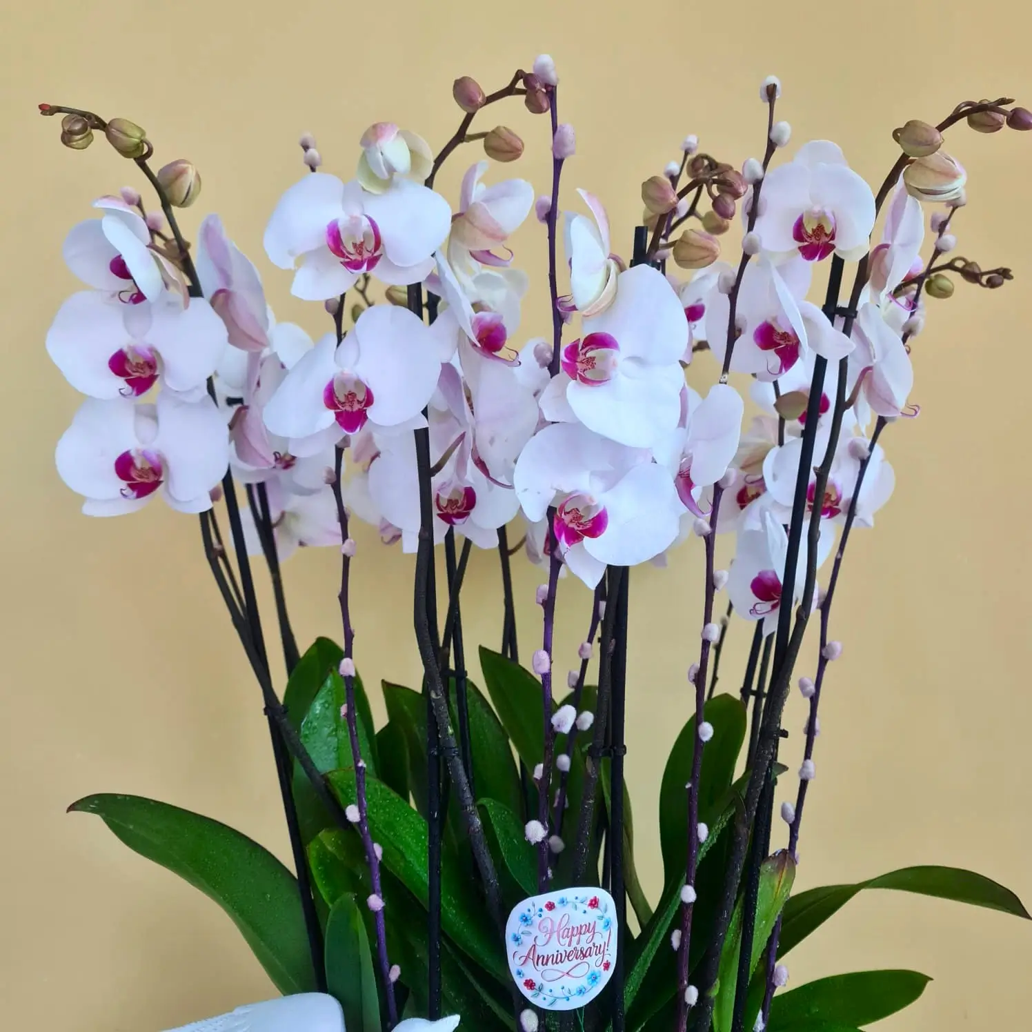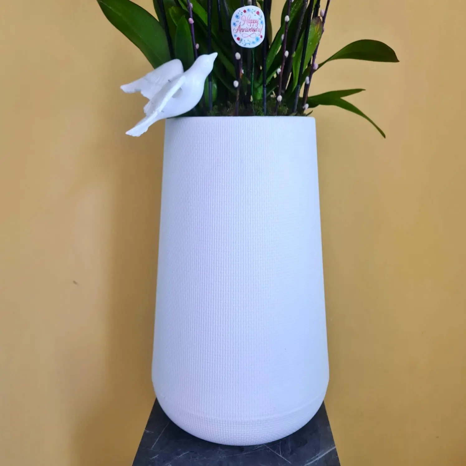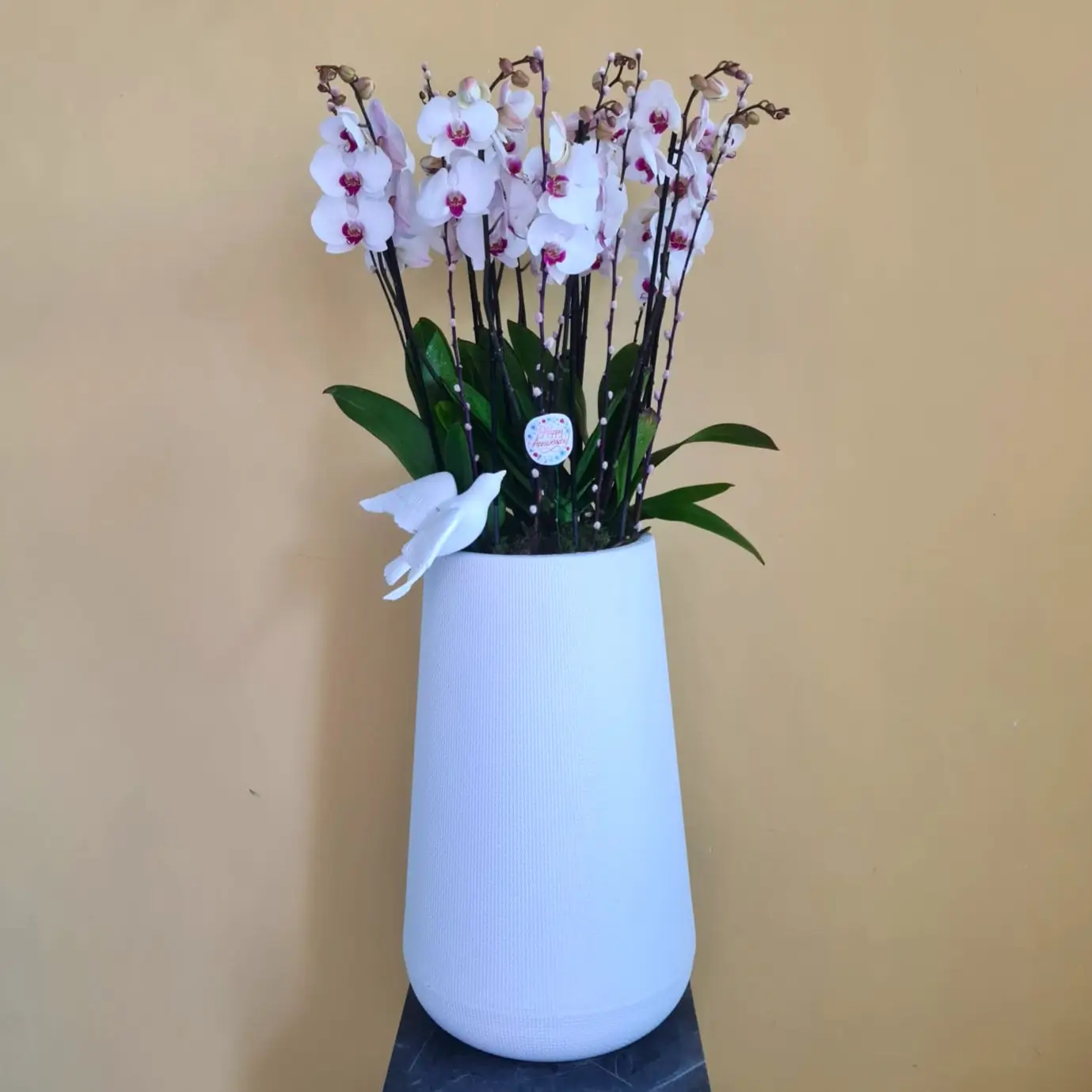 Phalaenopsis Red Lips in white planter.