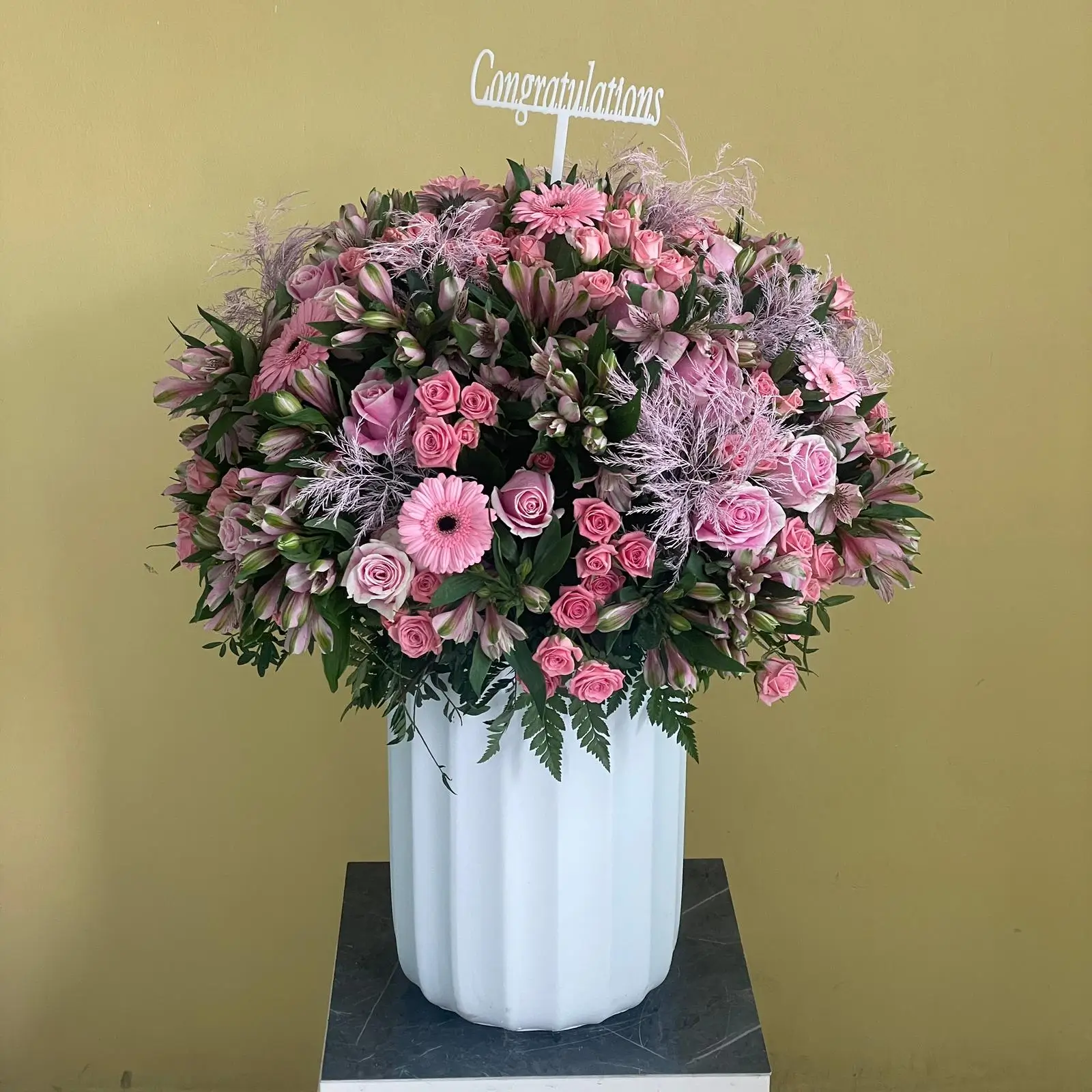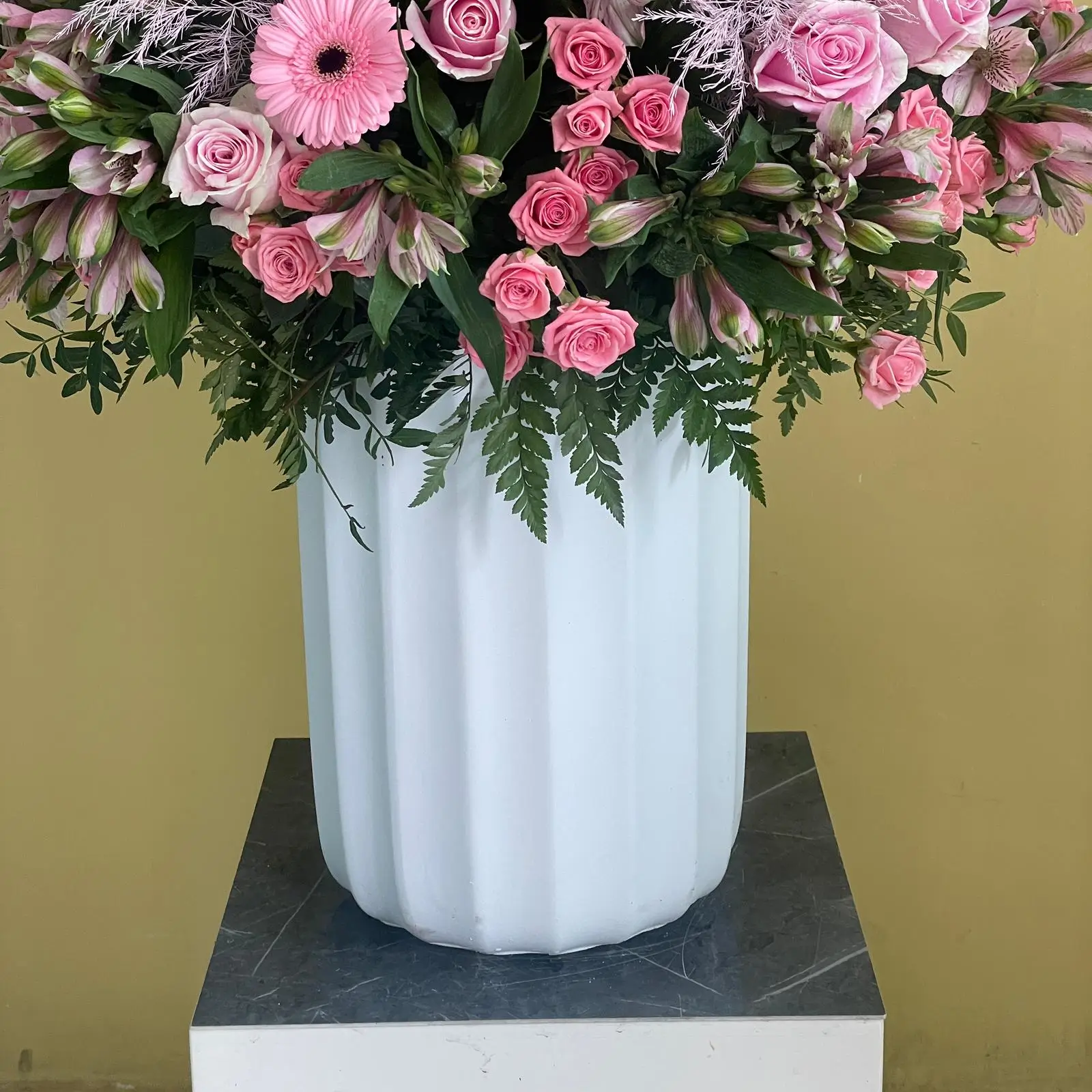 فازة خزفية جميلة مليئة بأزهار السترومريا، بيبي روز، جربيرا، تريفيرن ولمسات ناعمة من الأوراق الخضراء.