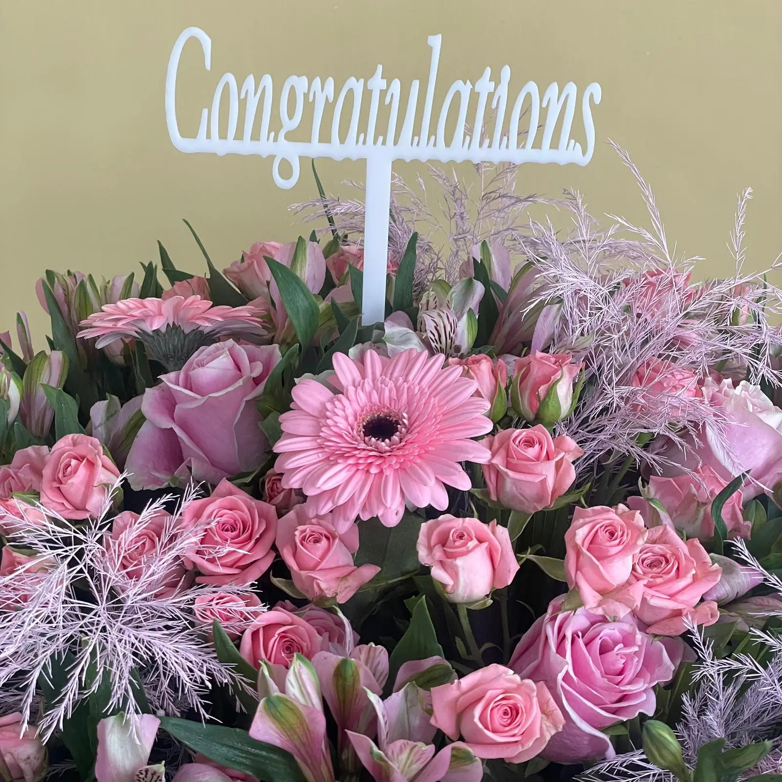 A beautiful ceramic vase filled with alstroemerias, baby roses, gerbera, trefern and delicate green touches.