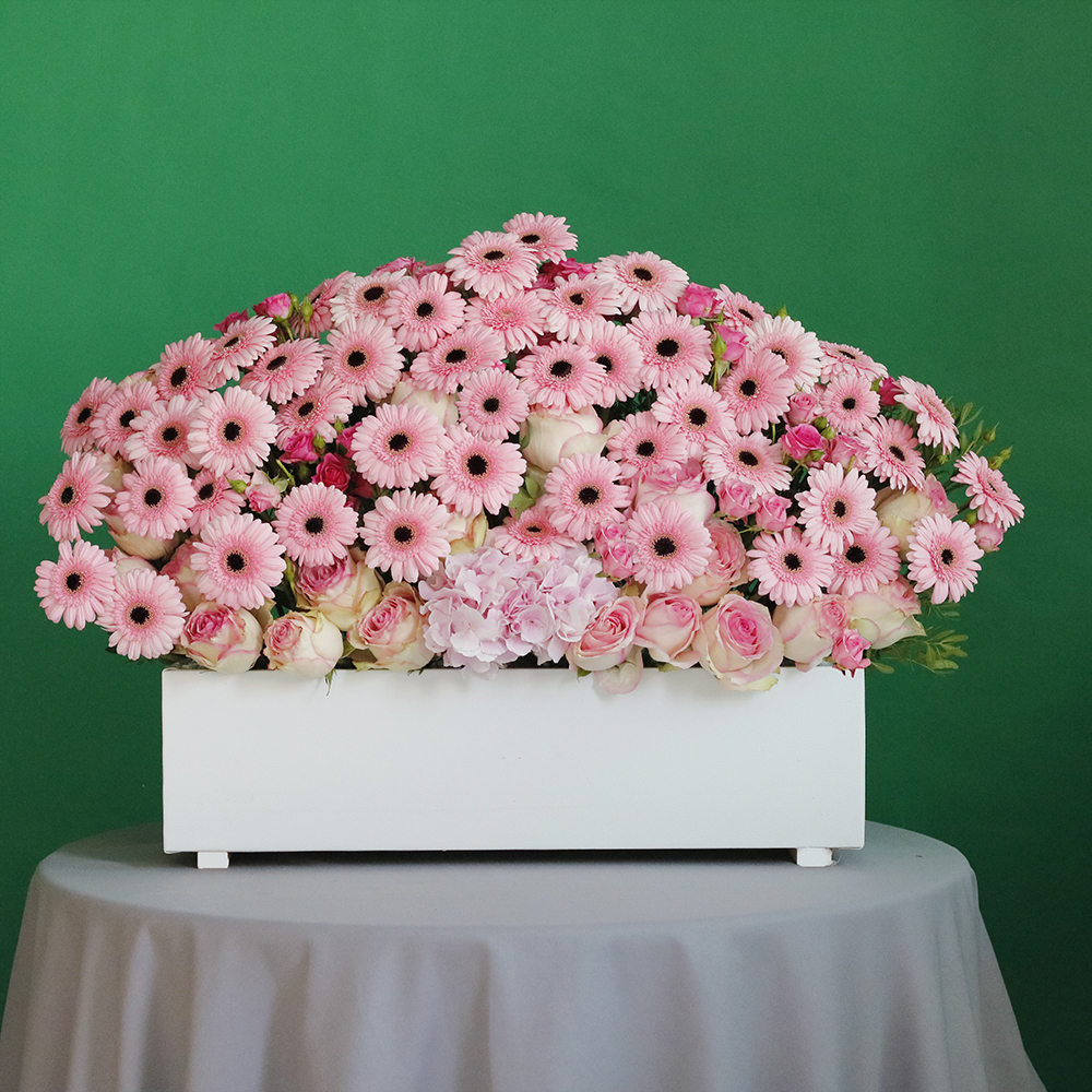 | Beautiful pink gerbera rose and baby rose in a luxury vases |