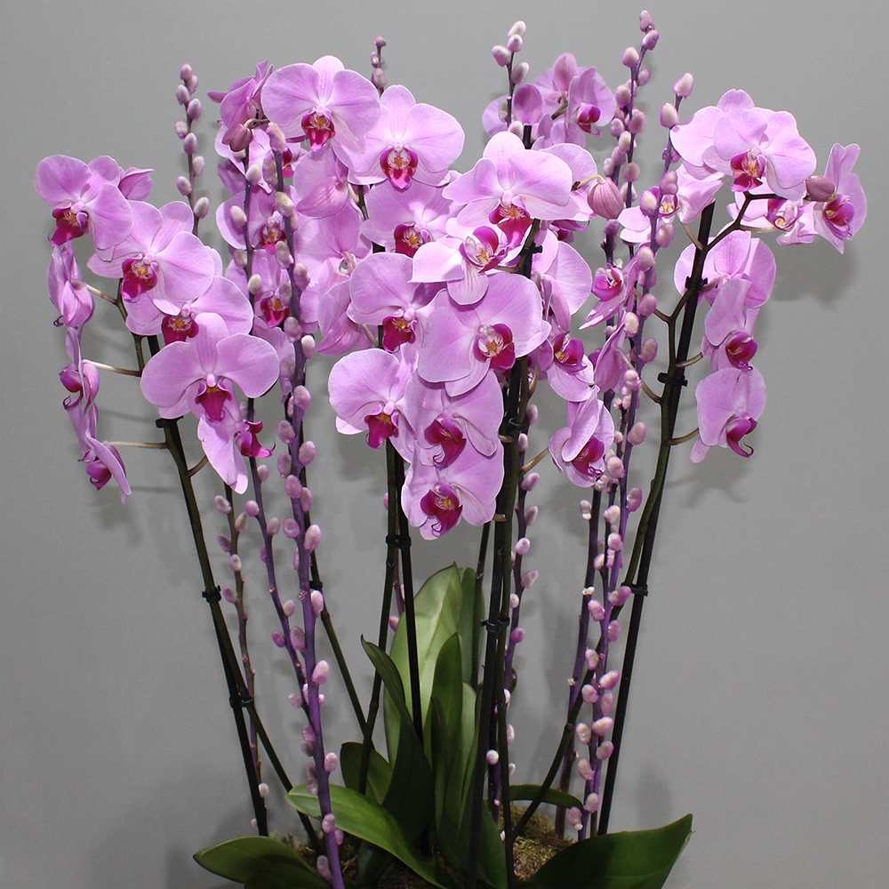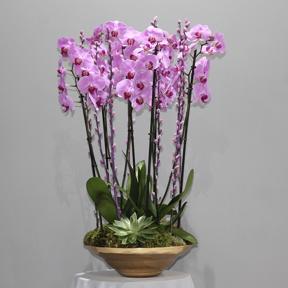 Amazing Pink orchids in a round gold vase