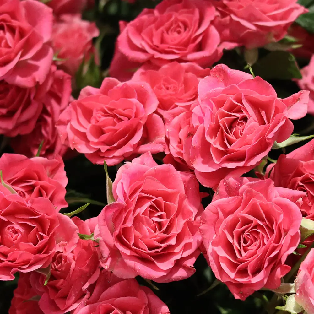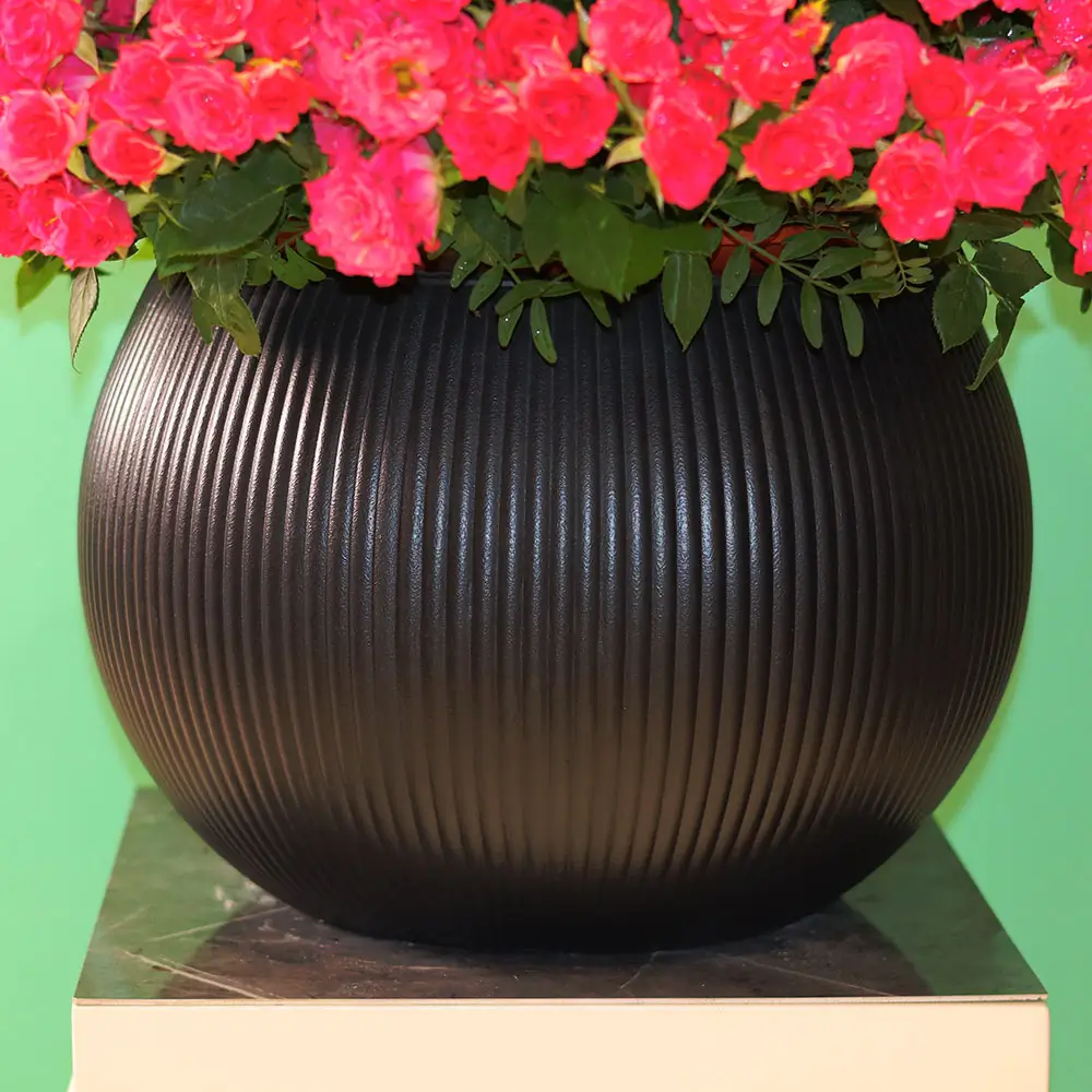 زهور جميلة من الورود الصغيرة باللون الوردي في مزهرية مستديرة.