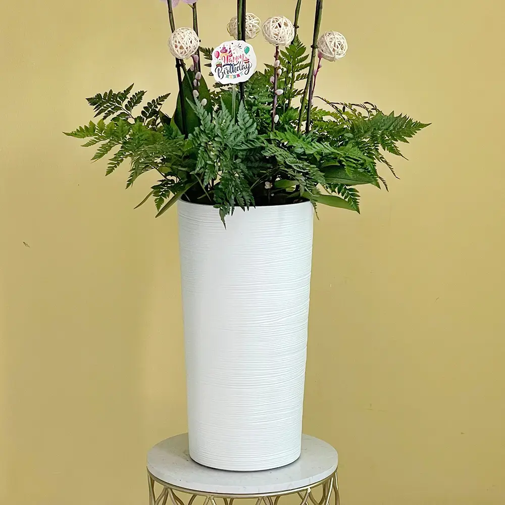 بساتين الفاكهة الوردية المذهلة في مزهرية مستديرة