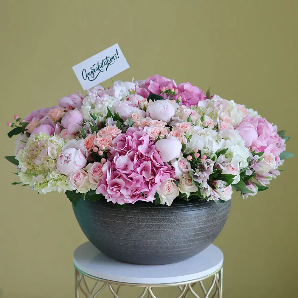 This bouquet contains hydrangeas,peony, and baby roses in a amazing vases.