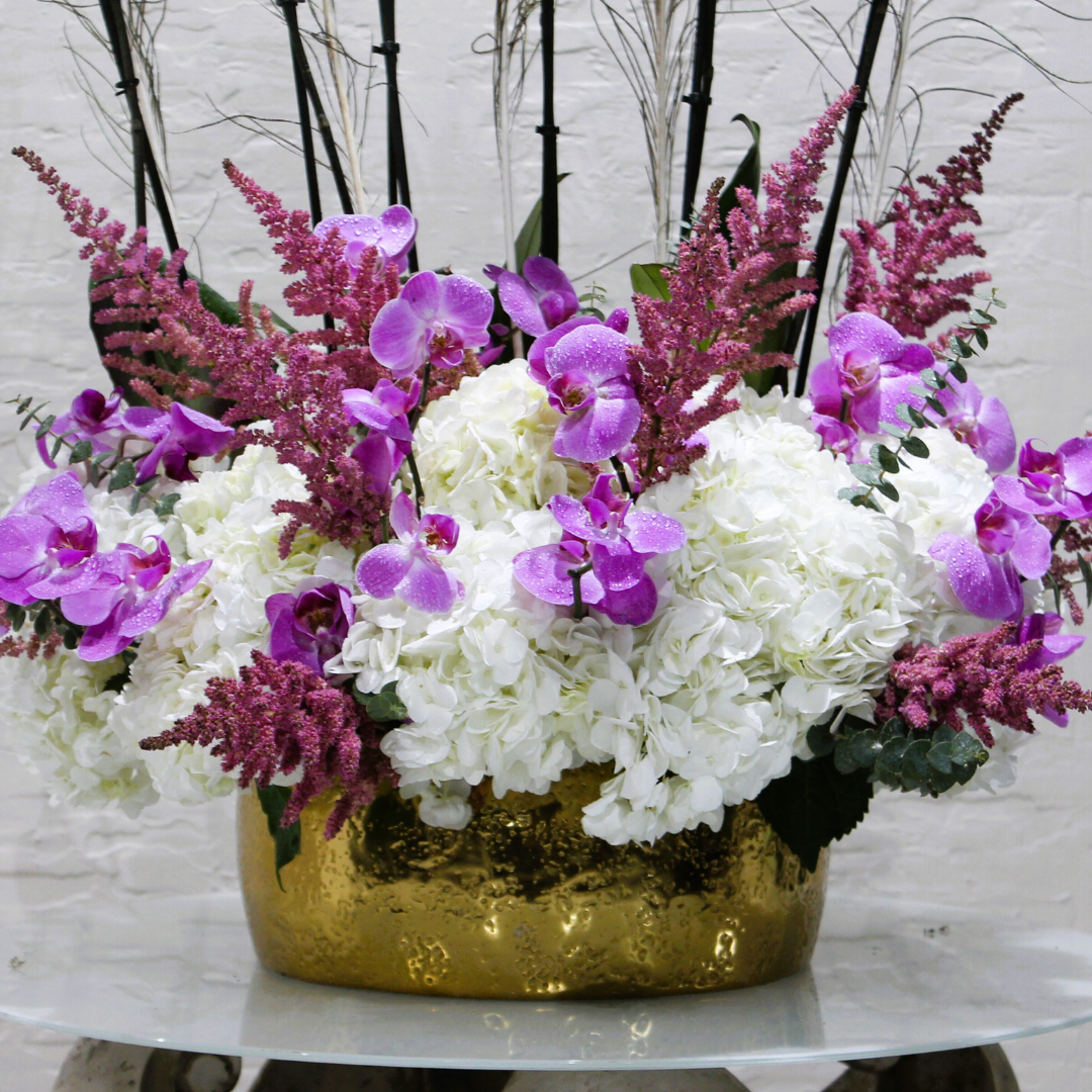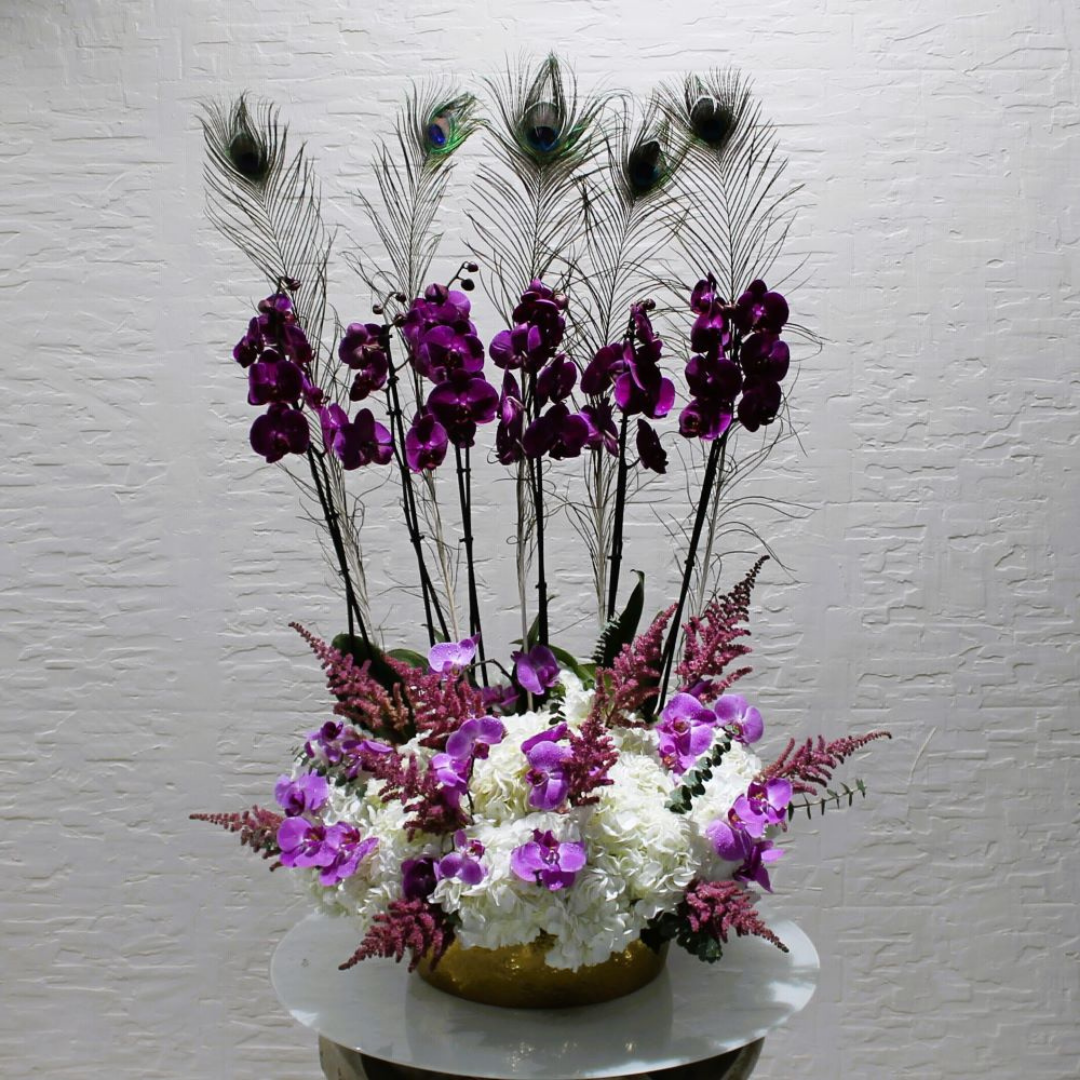 Most beautiful purple orchids arranged in a golden vase with hydrangea white,astilbe,orchids with peacock feathers.