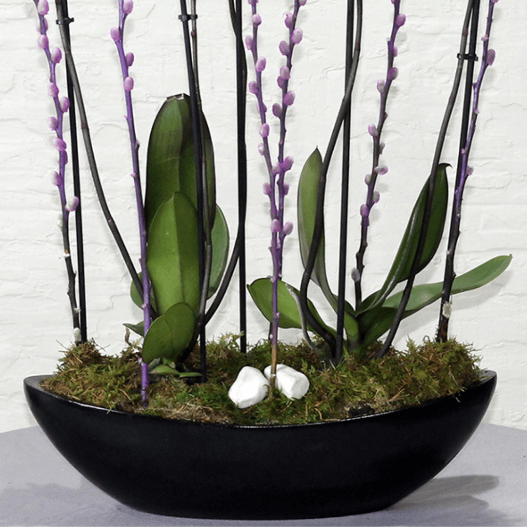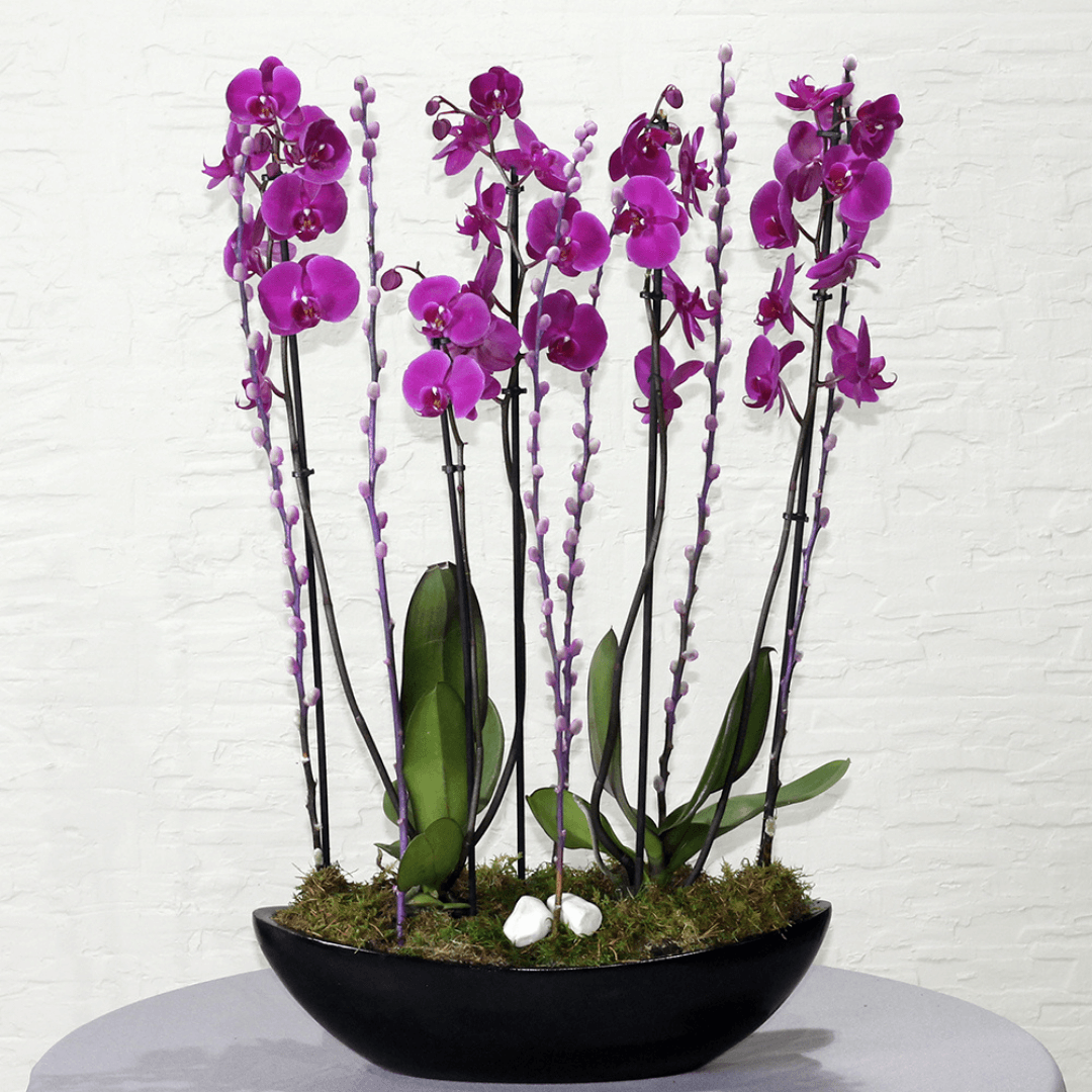 زهور الأوركيد الأرجوانية المذهلة في مزهرية على شكل قارب