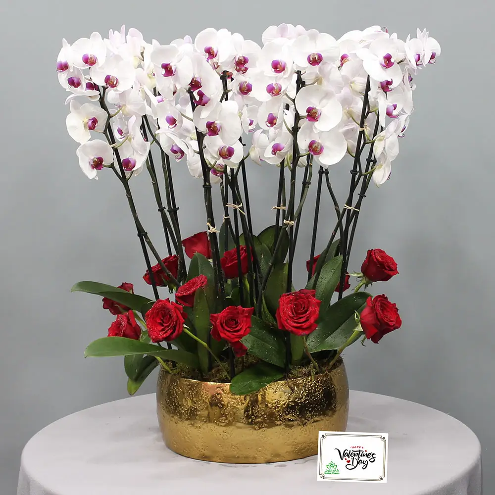 تنسيق زهور الأوركيد ذات الشفاه الحمراء مع الورود في مزهريات ذهبية جميلة