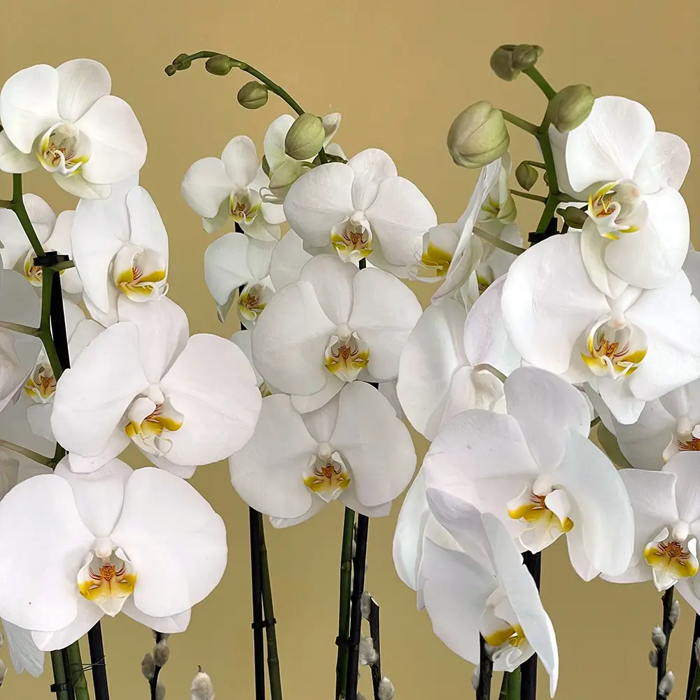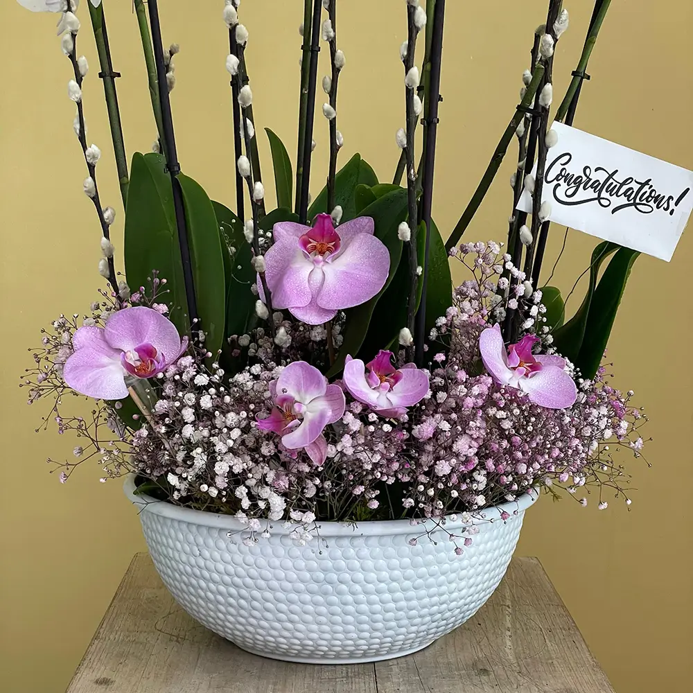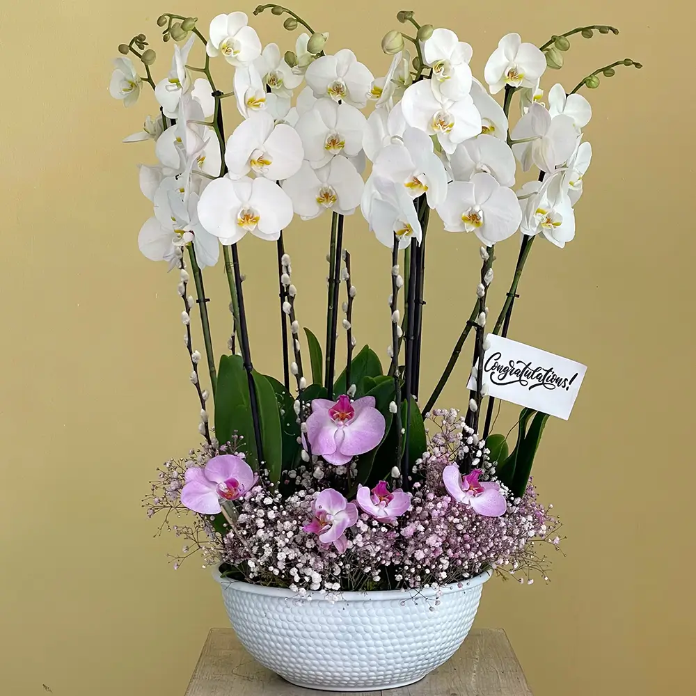 لمسة مذهلة من الأوركيد الأبيض مع الأوركيد الوردي والجيبسوفيلا في مزهريات فاخرة