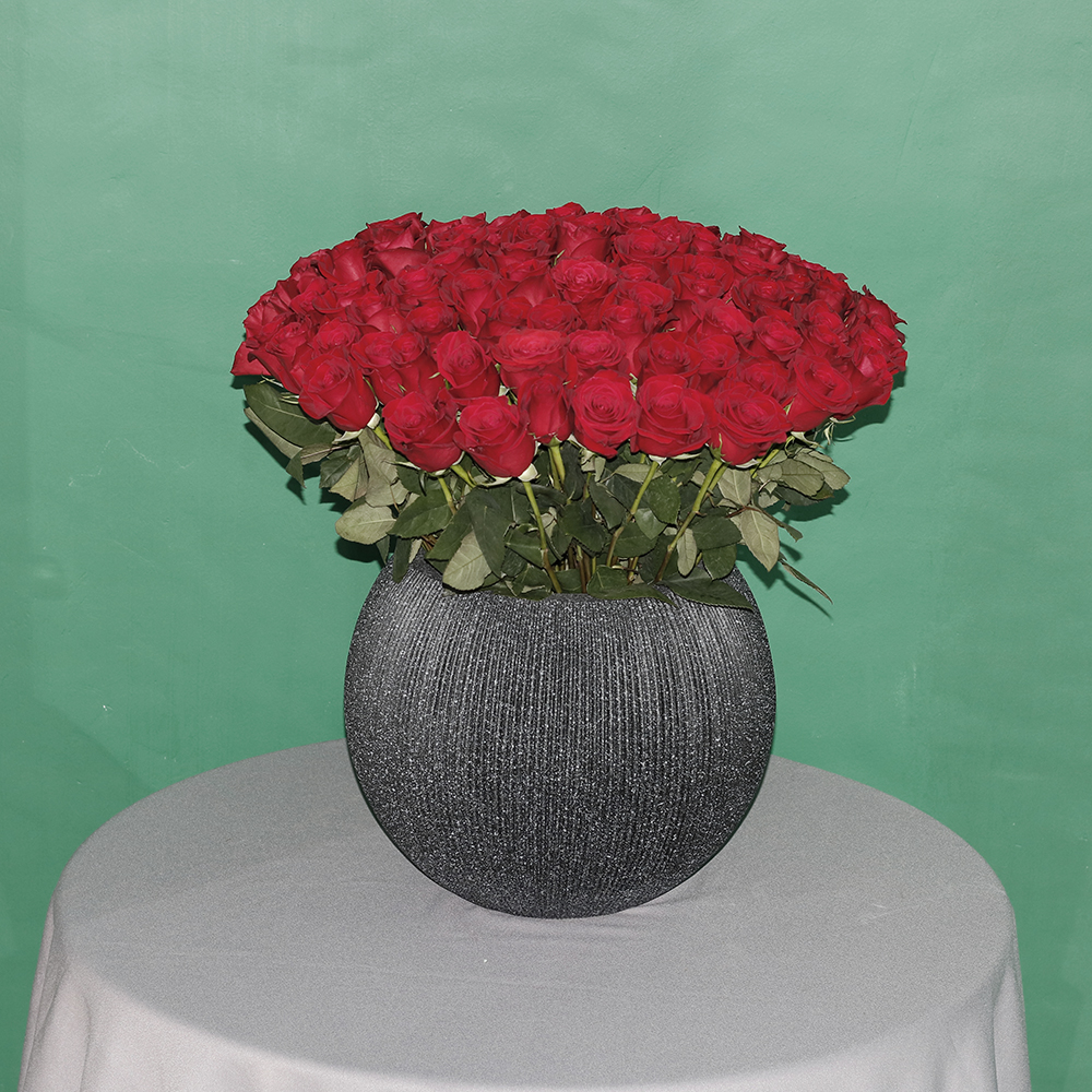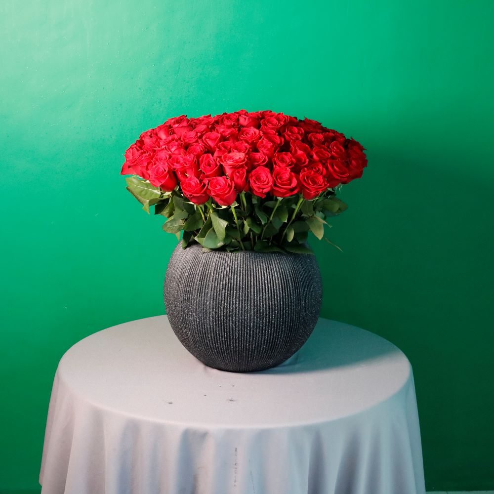 | Beautiful arranged in a red roses with a luxury round vases. |