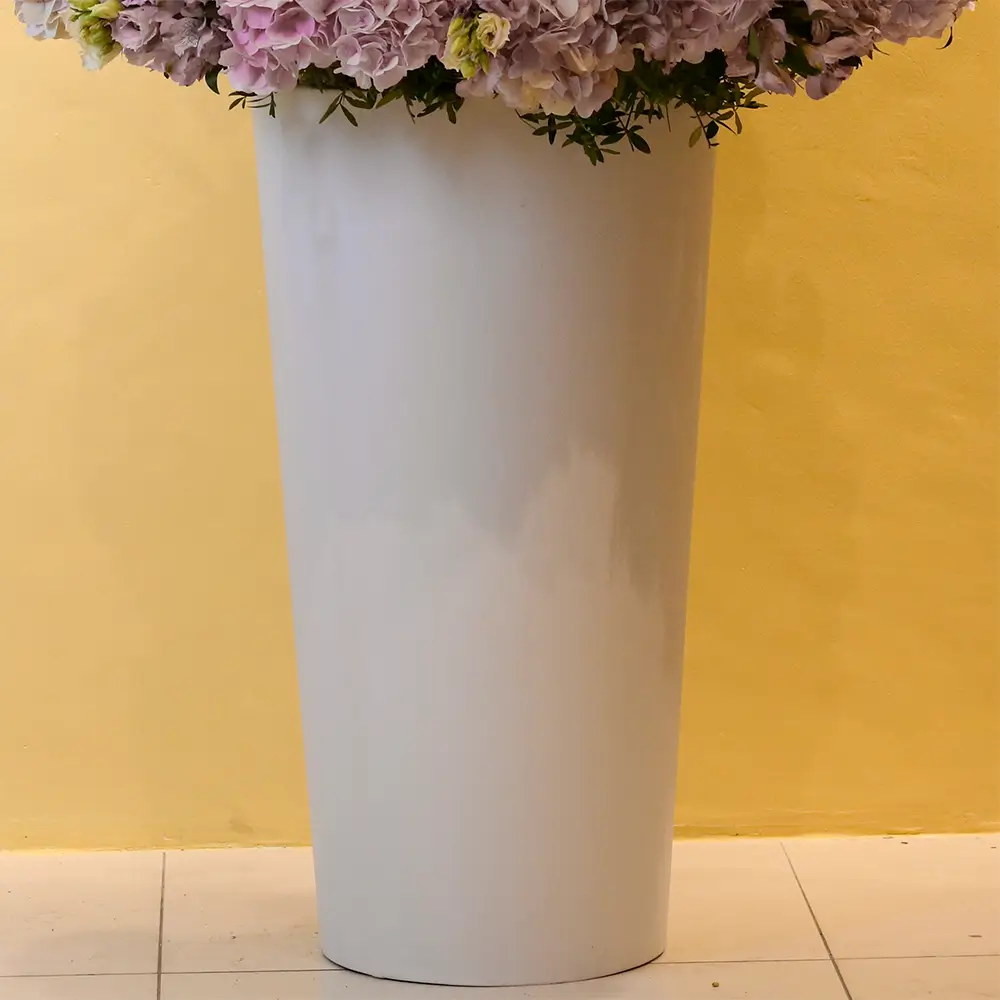 Beautiful round hydrangeas, roses, alstroemeria, rice flower and baby roses in a tall vase.
