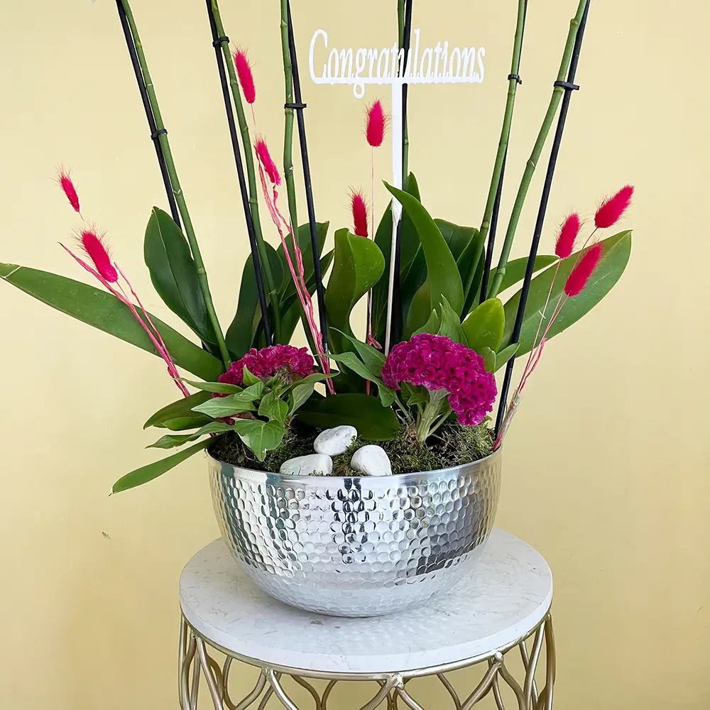 فازة أنيقة مليئة بنباتات الأوركيد ذات الشفاه الحمراء.