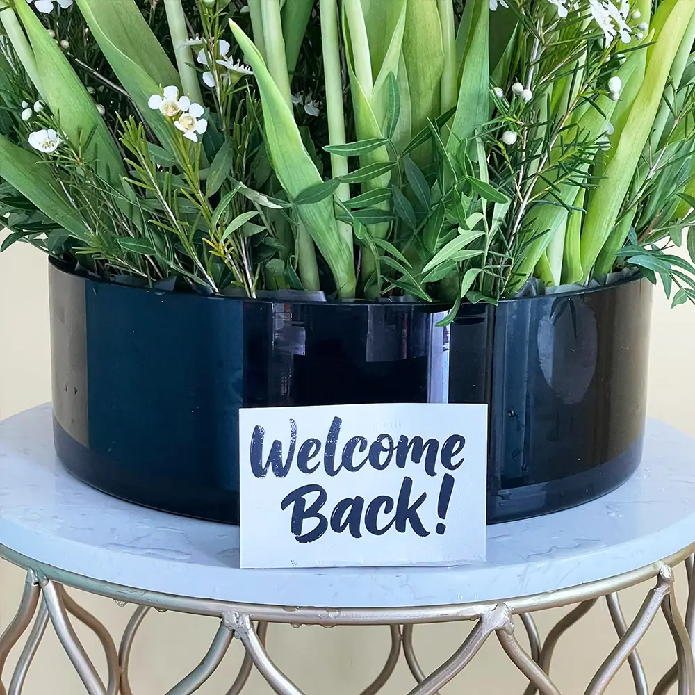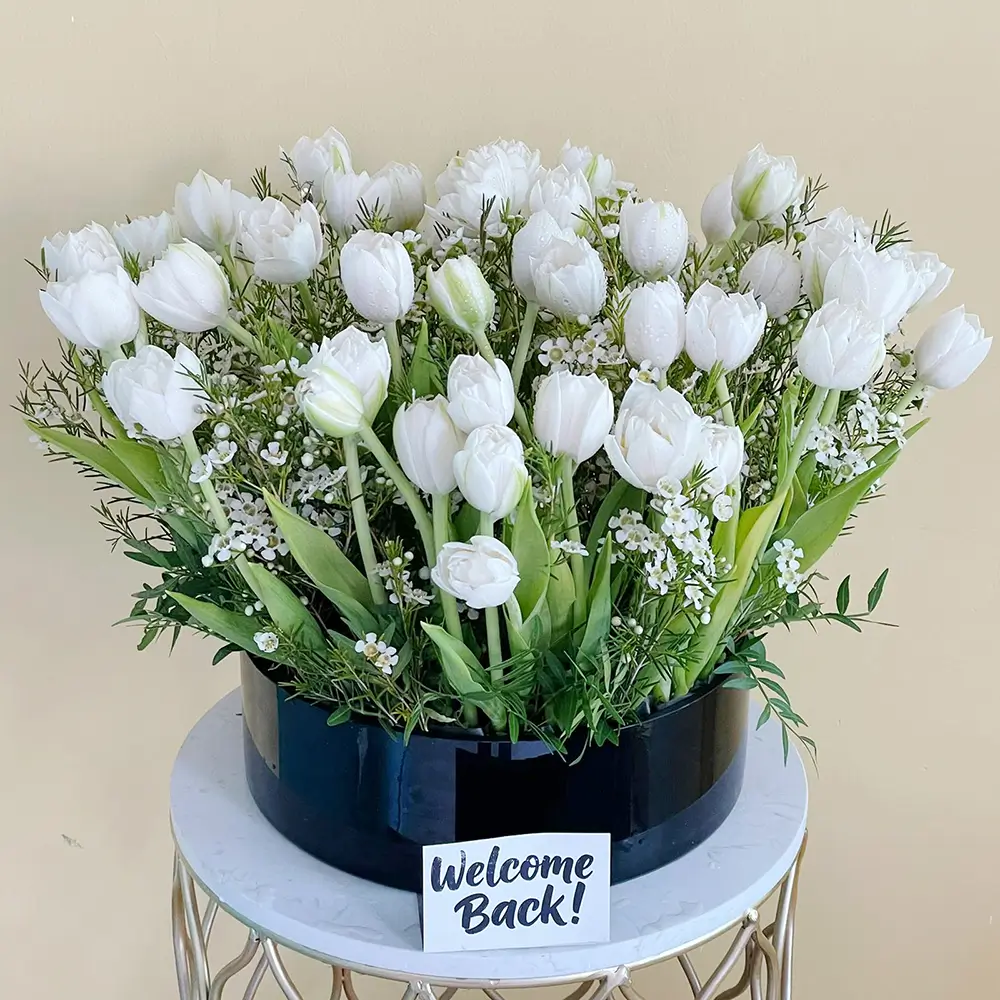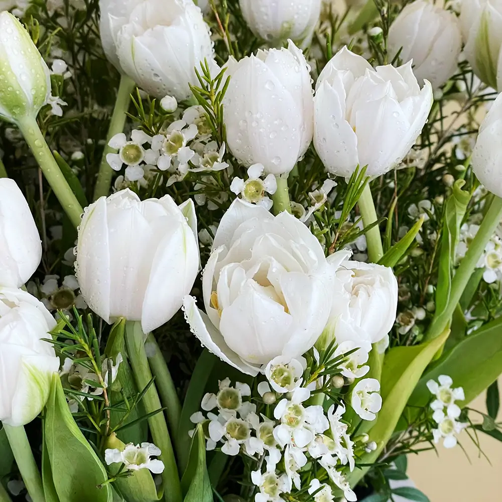 A bouquet containing Tulip with Chamelaucium arranged beautifully in a Glass vase