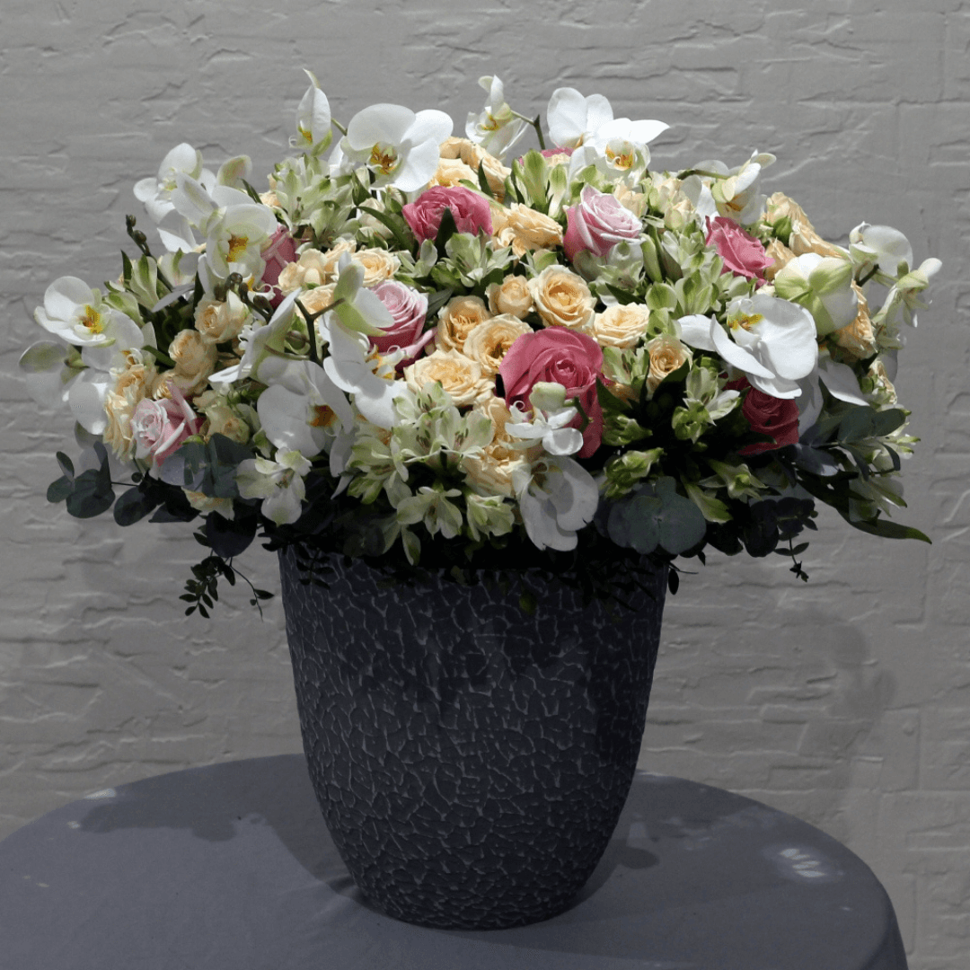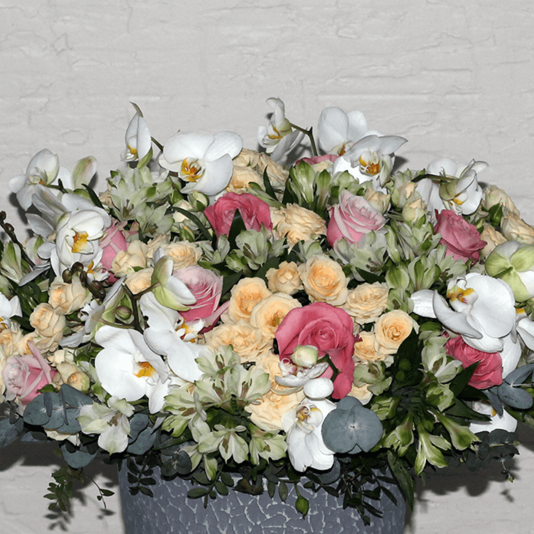 Beautiful orchid rose, baby Rose, alstromaria, green in a elegant vase