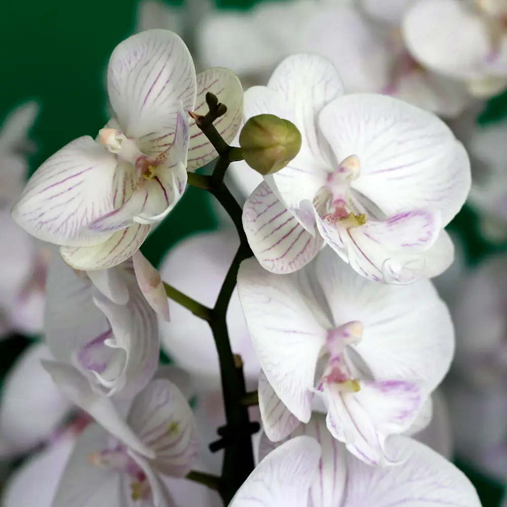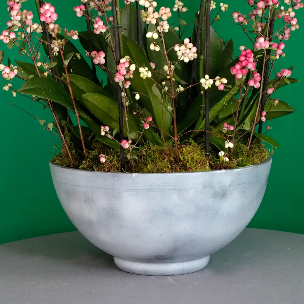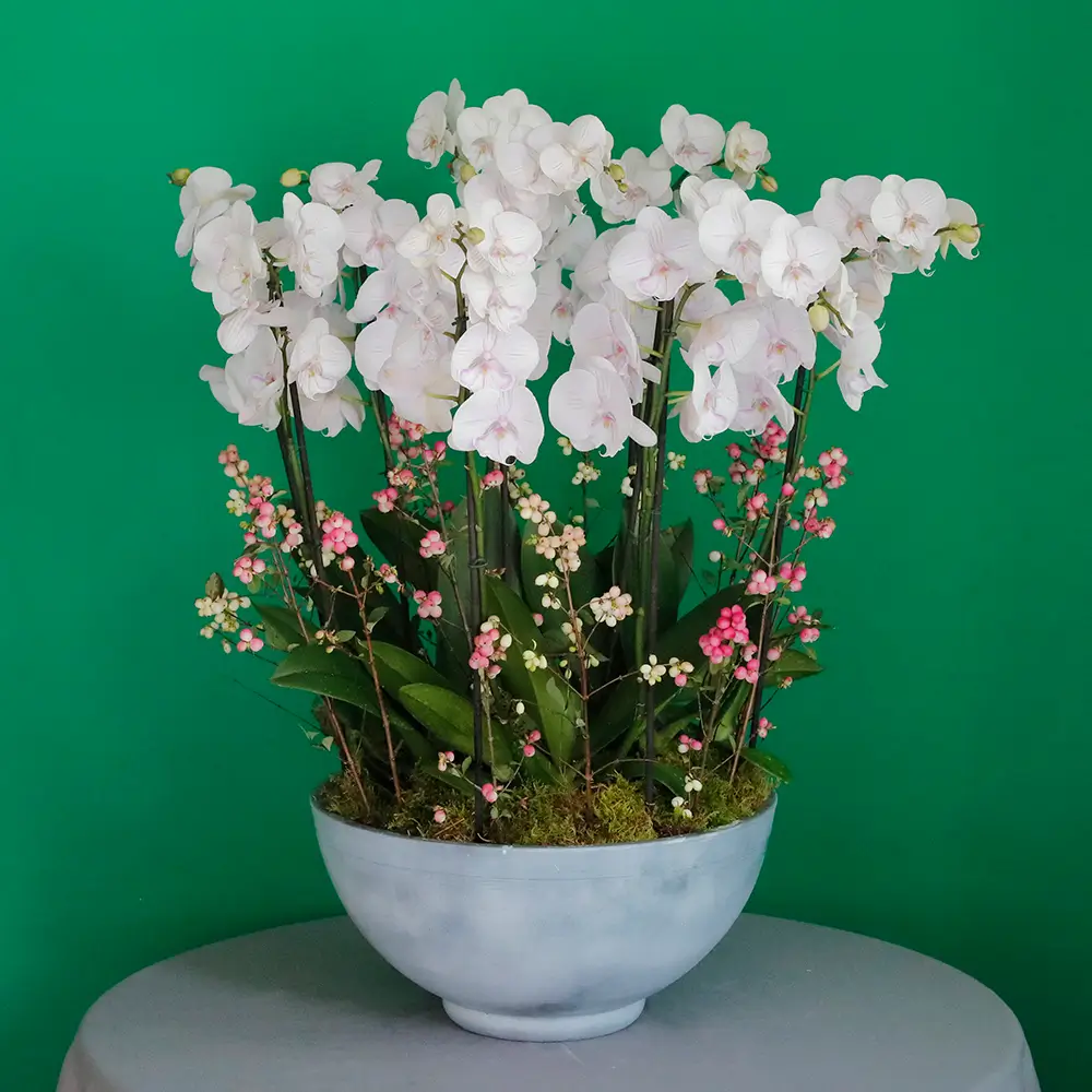 أوركيد وردي فاتح مذهل مع التوت الثلجي في مزهريات فاخرة