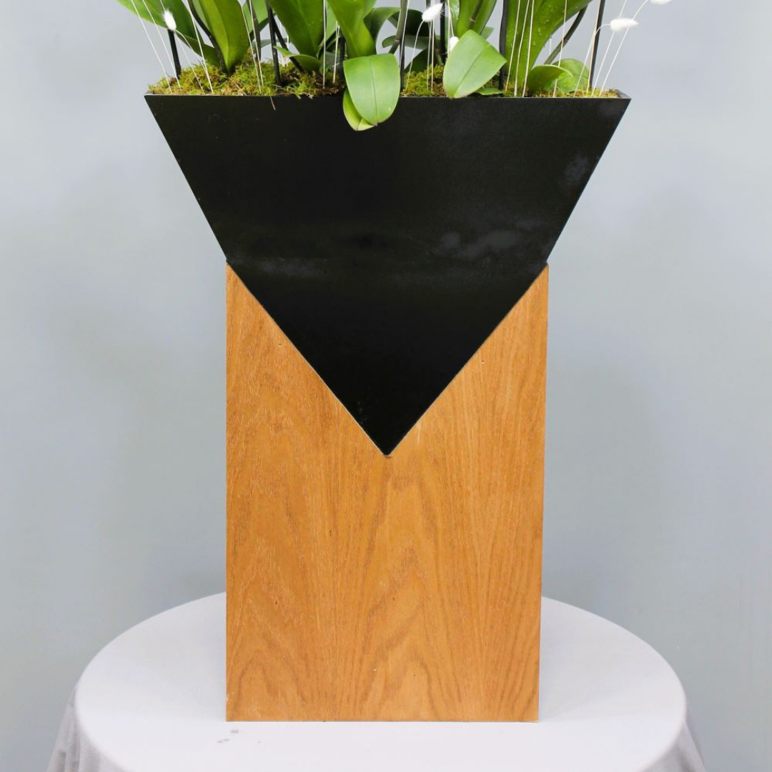زهور الأوركيد ذات الشفاه الحمراء الرائعة مرتبة في مزهرية باللونين الأسود والبرتقالي.