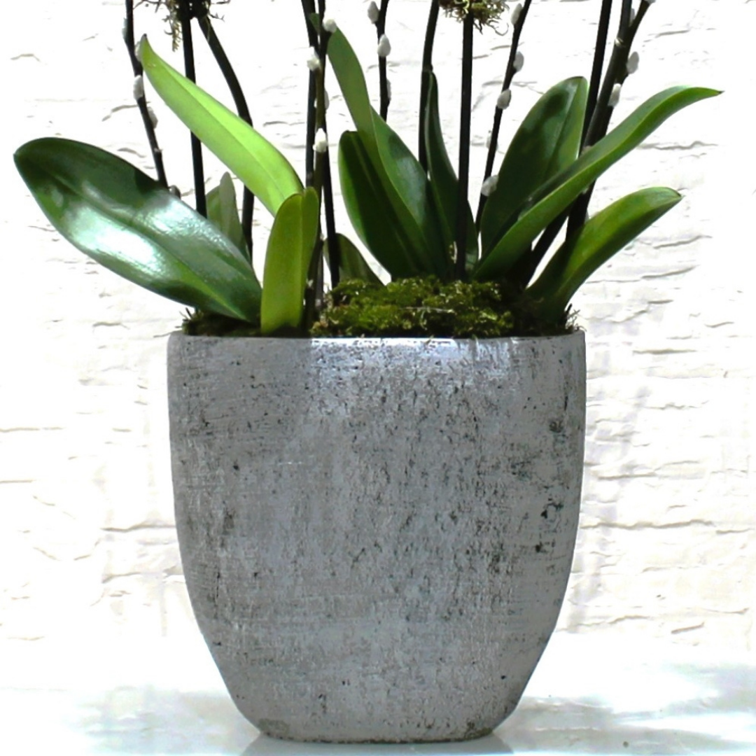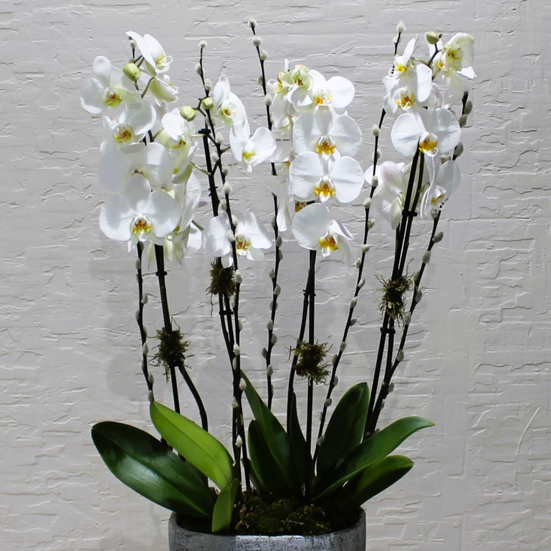 نباتات الأوركيد البيضاء الرائعة مرتبة في مزهرية من السيراميك.