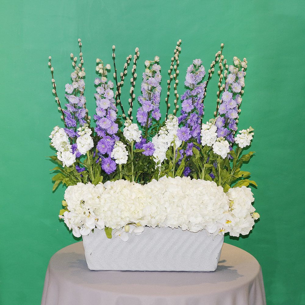 | ترتيب جميل في الدلفينيوم، ماتيولا، الكوبية مع المزهريات الفاخرة. |