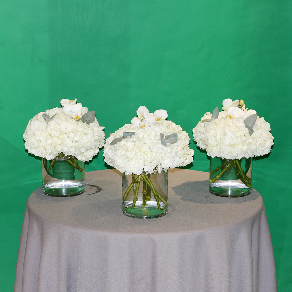 | Beautiful arranged in a hydrangeas, orchid and green with a luxury vases. |