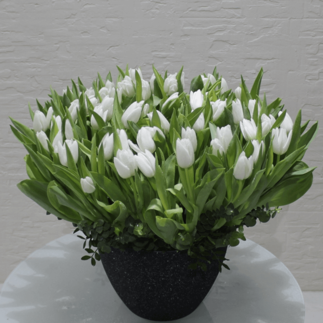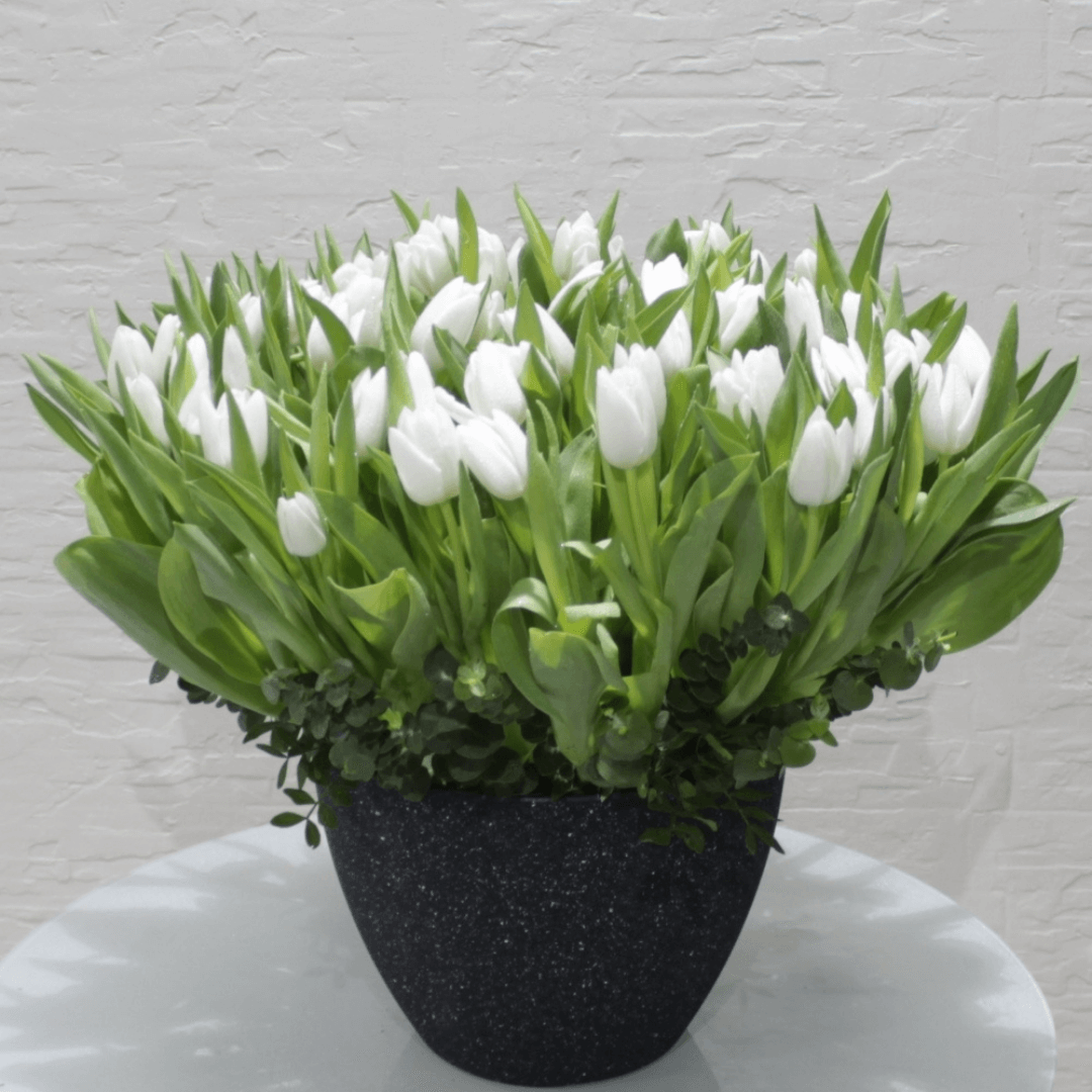 توليب أبيض مذهل مع أخضر في مزهرية سوداء