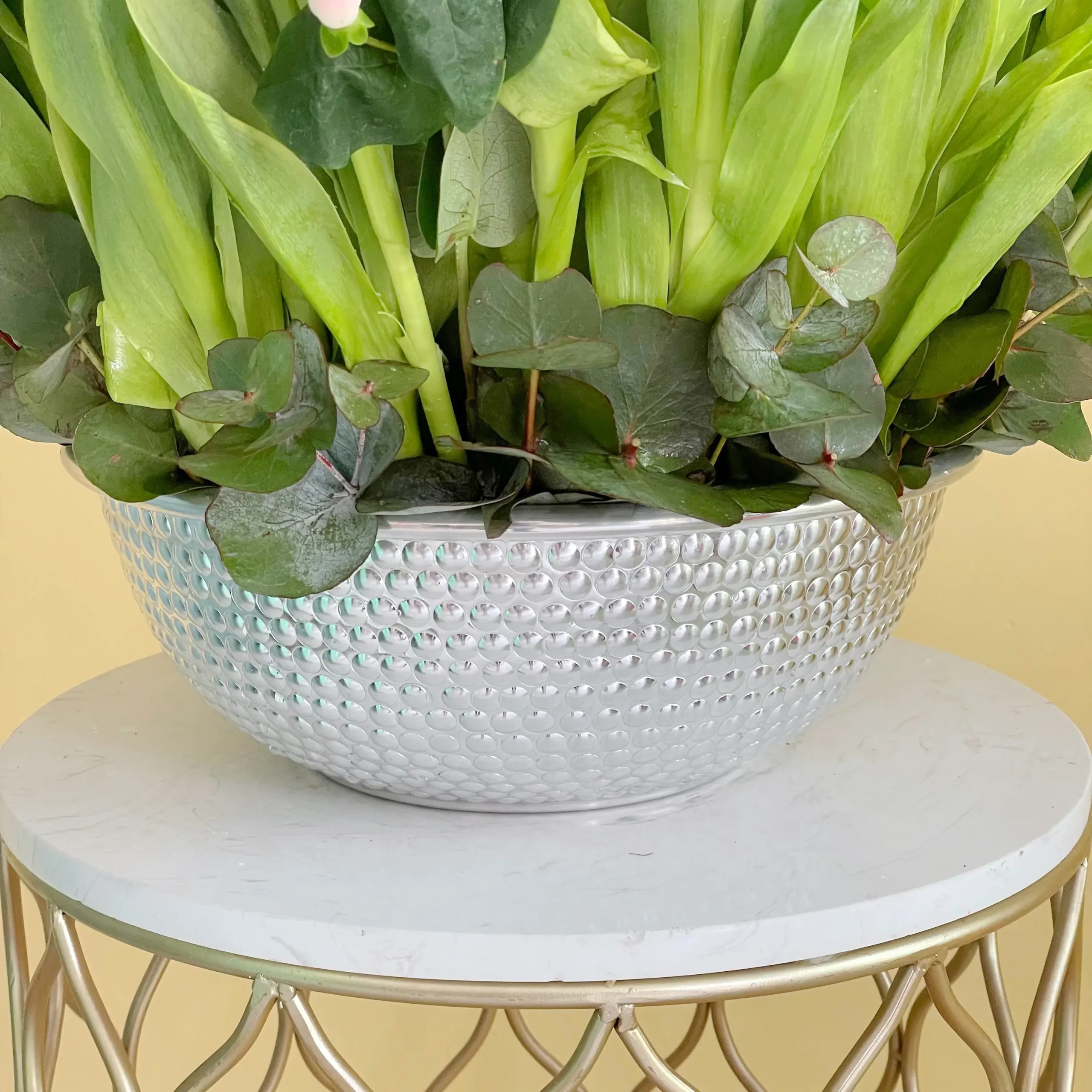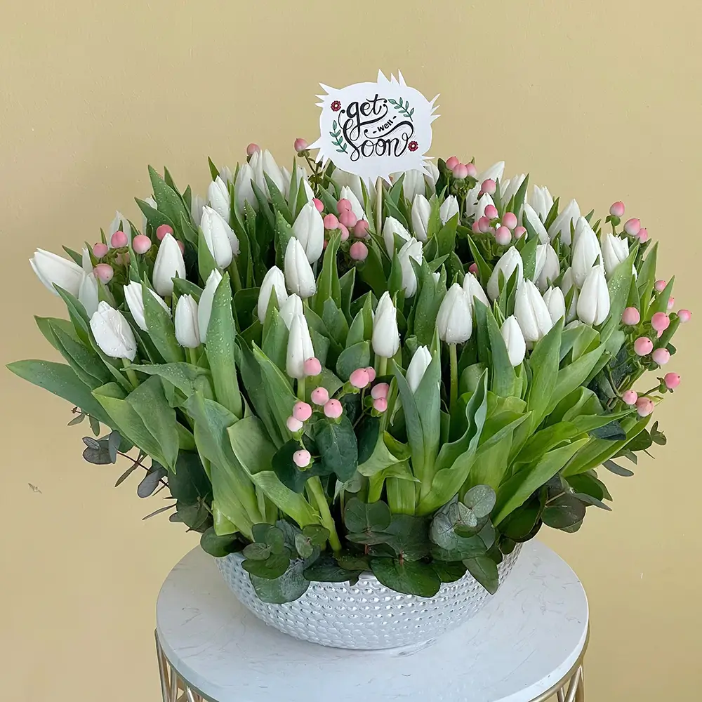 مزهرية أنيقة مليئة بالزنابق والهابيكوم