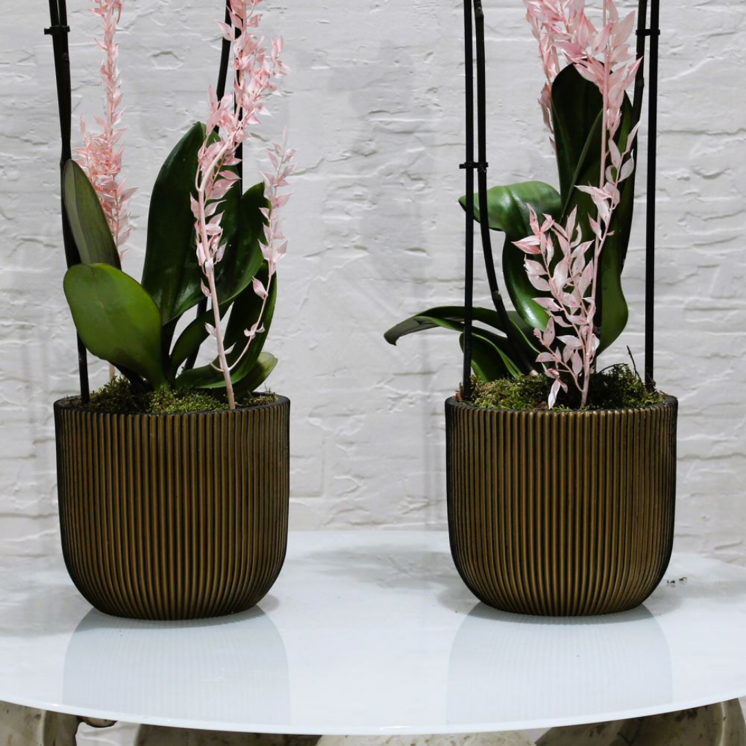 تنسيقة أوركيد أرجوانية مذهلة مع الرسكوس الوردي في مزهريتين.
