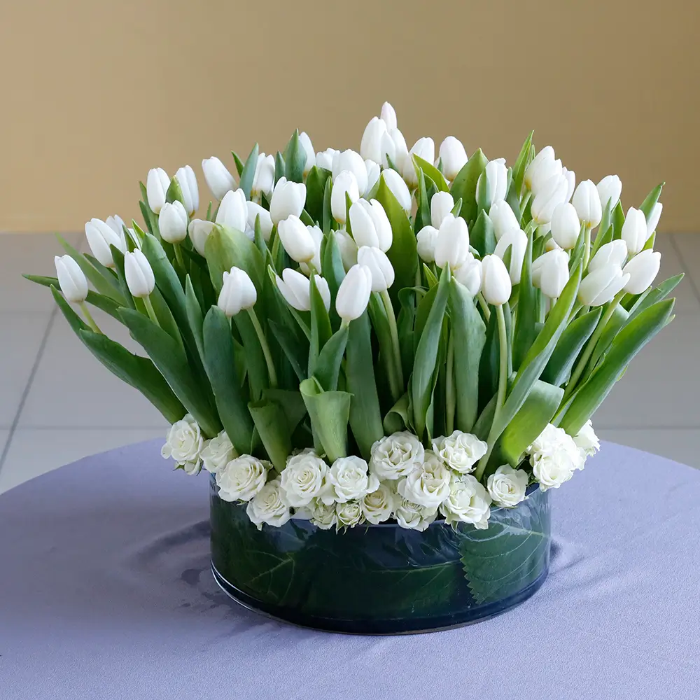 تنسيق رائع من زهور التوليب مع الورود الصغيرة في مزهرية ممتازة