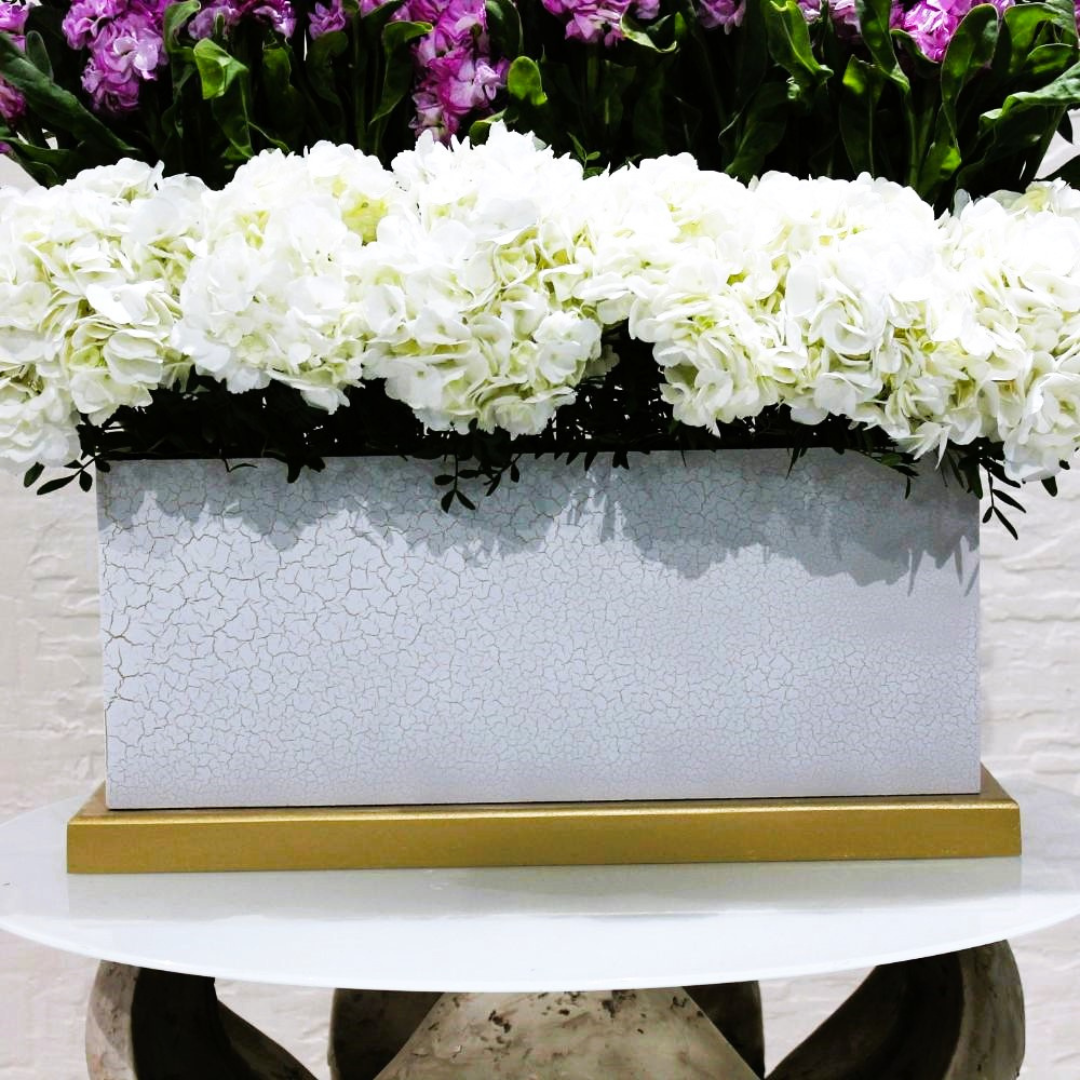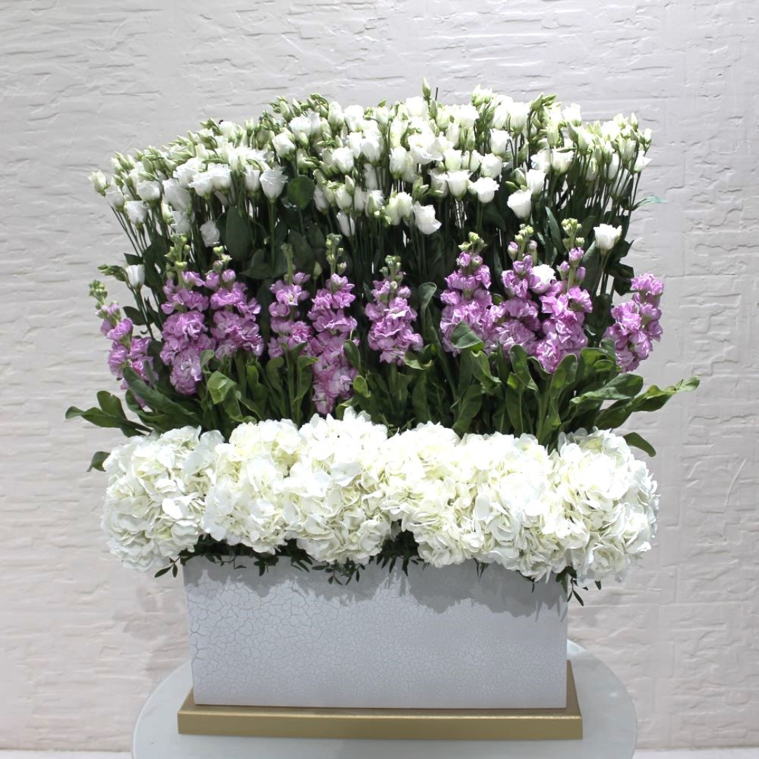 Beautiful white lisianthus and hydrangeas arranged with pink mathiola flowers in a special wooden vase.