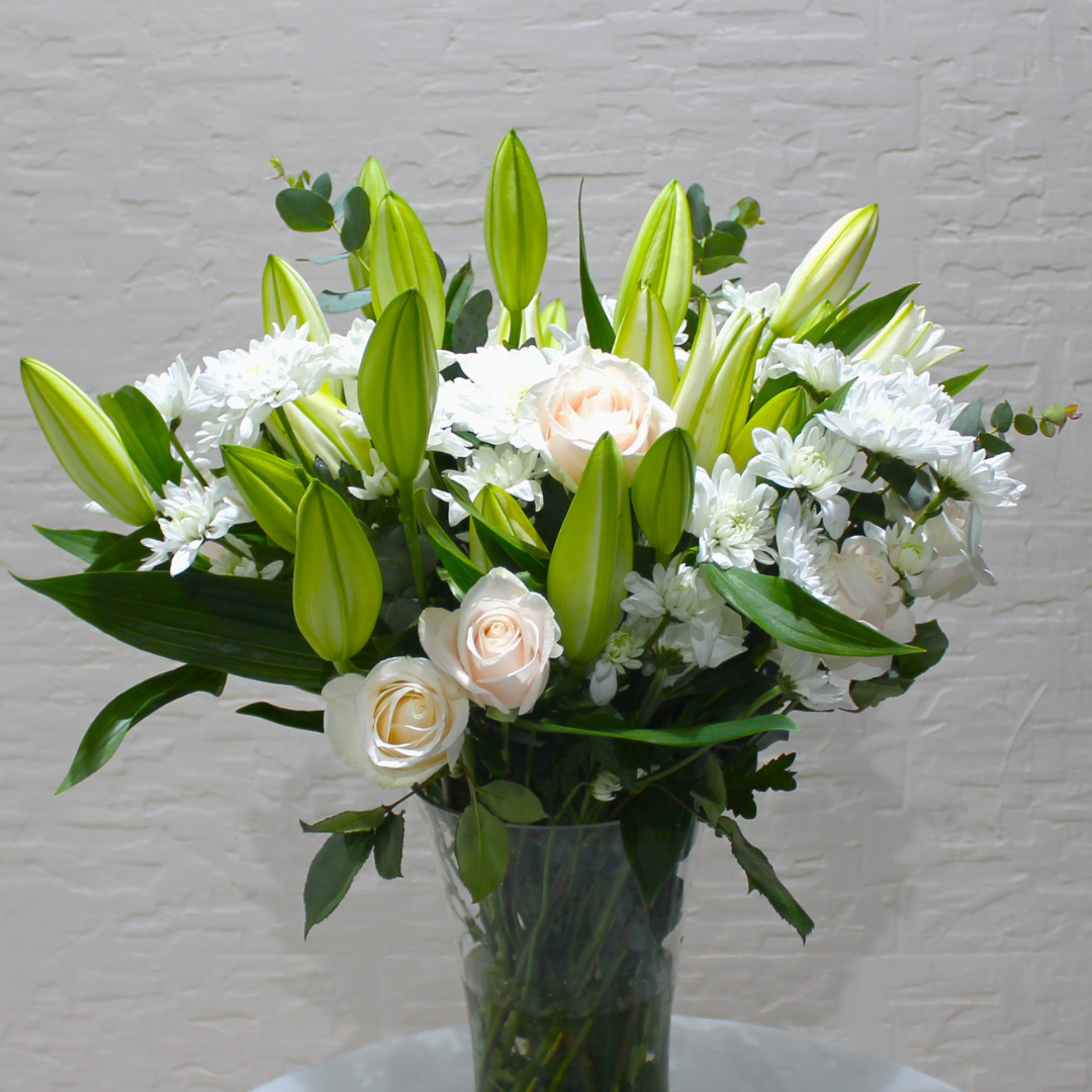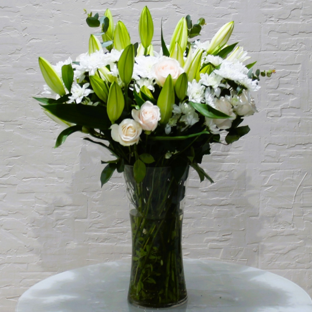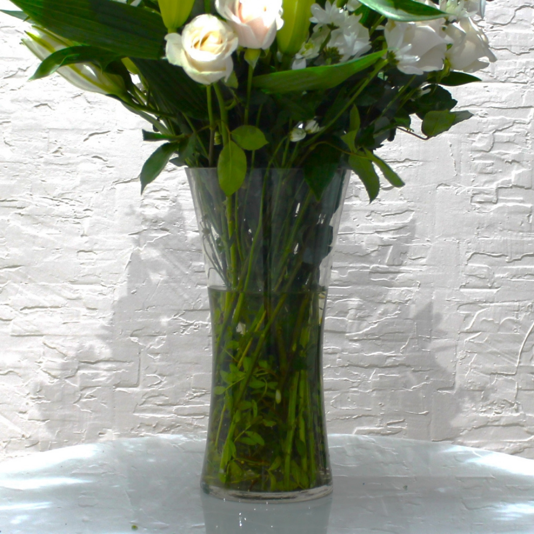زهور بيضاء جميلة مرتبة في مزهرية شفافة.