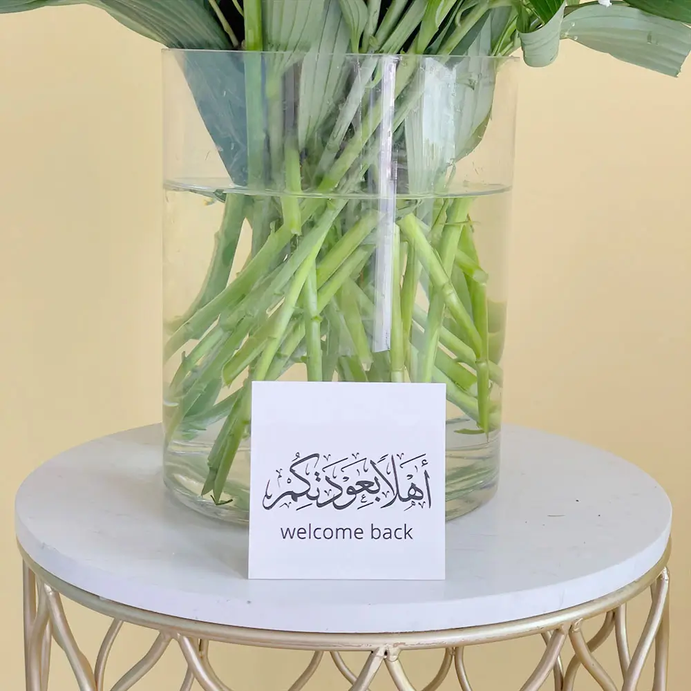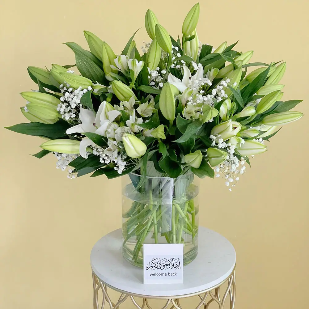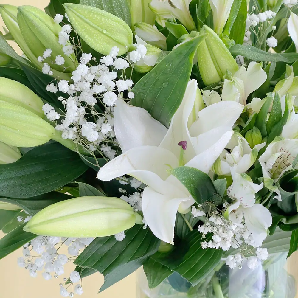 Beautiful white lilies & alstroemerias with Gypsophila arranged in a Glass Vase.