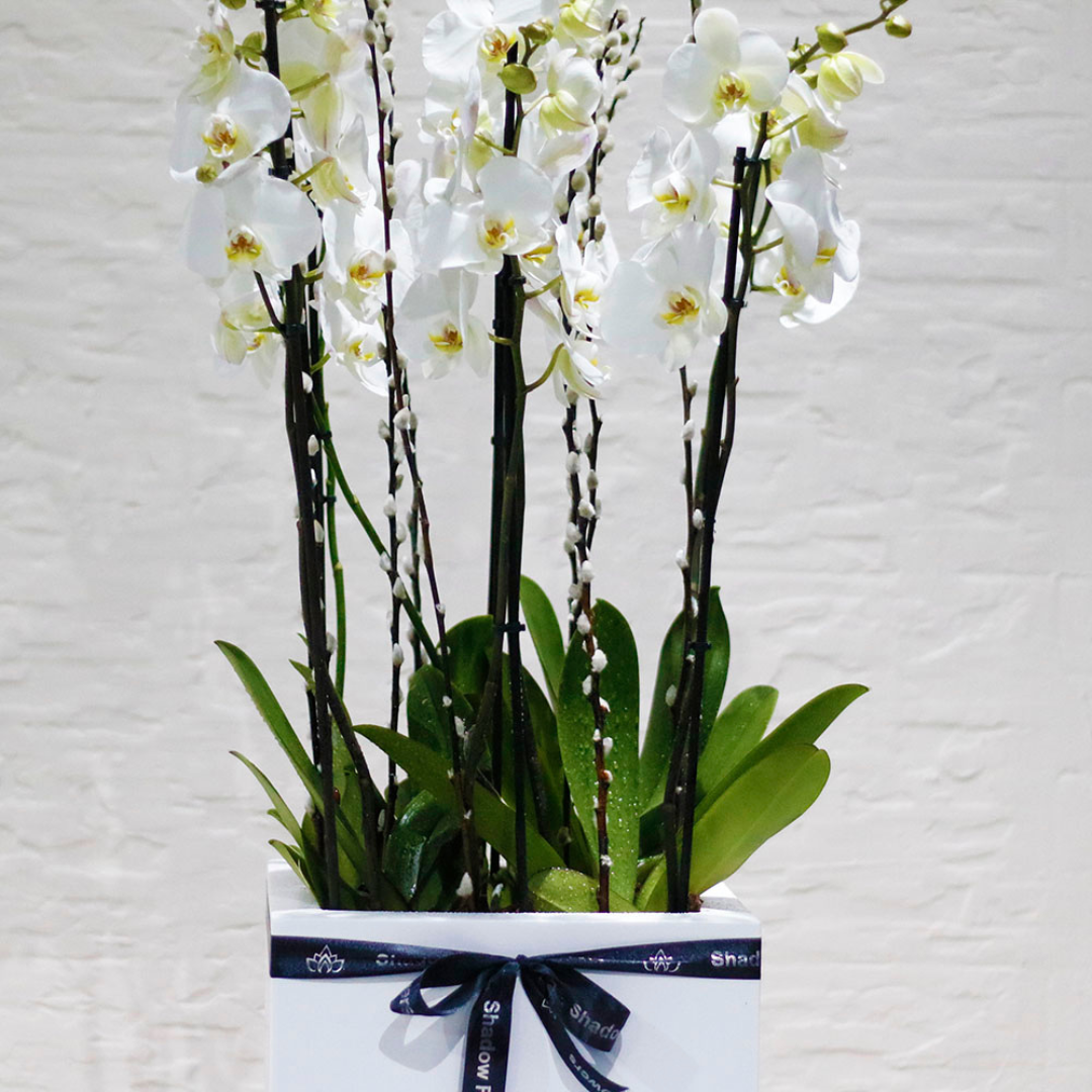 بساتين الفاكهة البيضاء المثالية في مزهرية مربعة بيضاء.