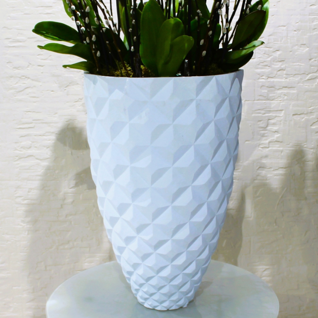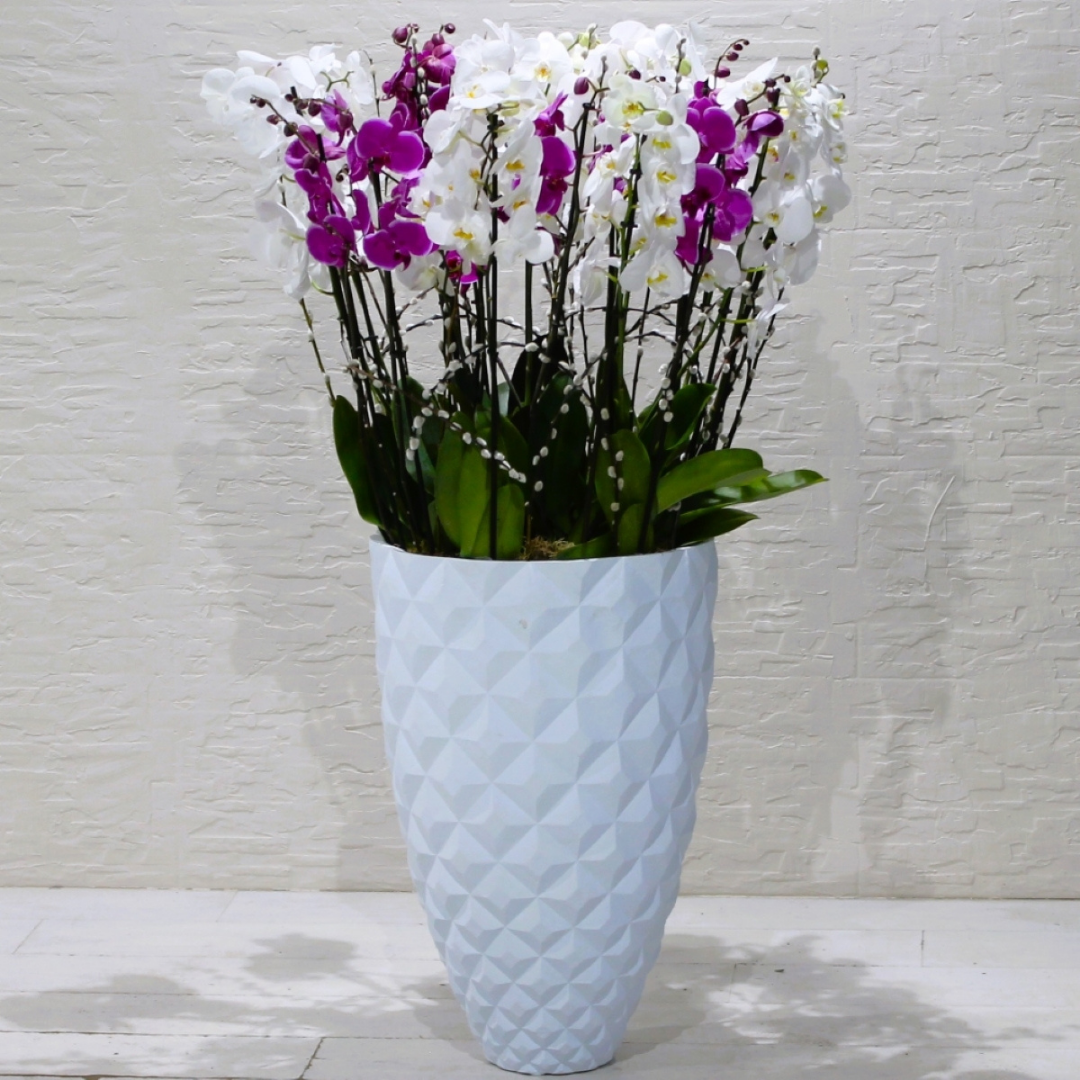 بساتين الفاكهة البيضاء والأرجوانية الجميلة في مزهرية بيضاء.