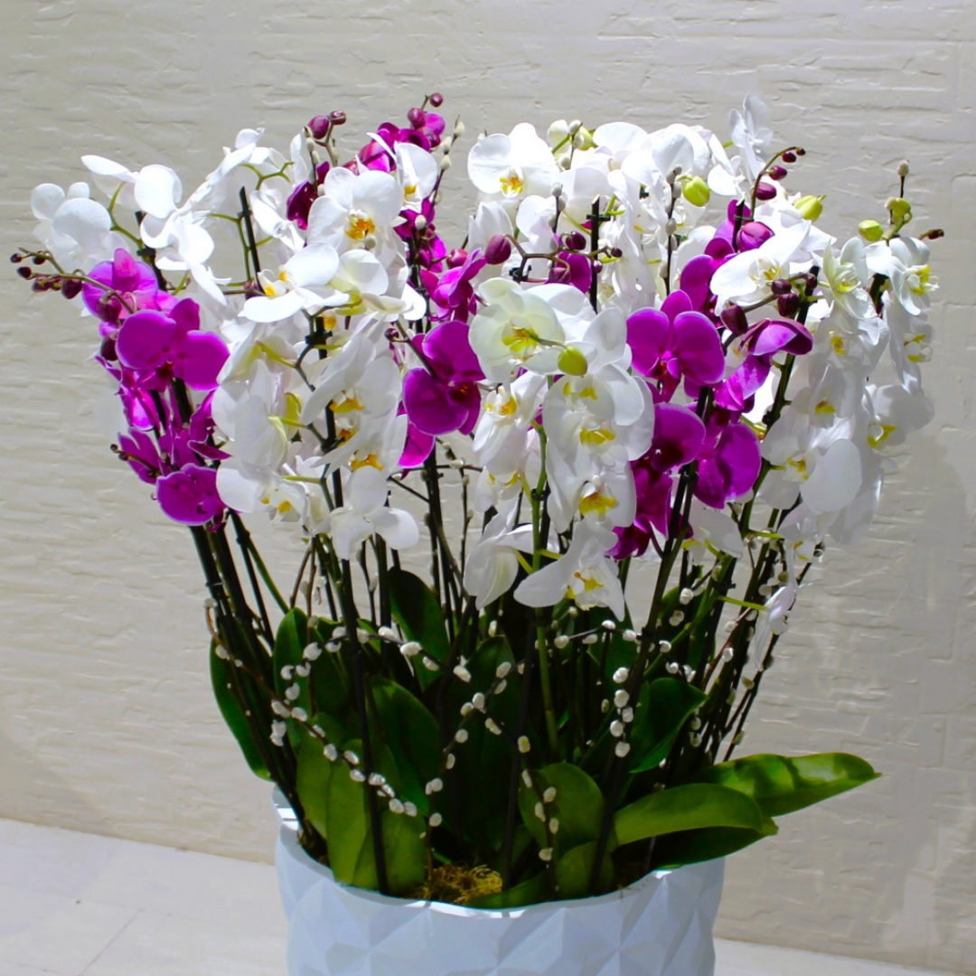 Beautiful white and purple orchids in a white vase.
